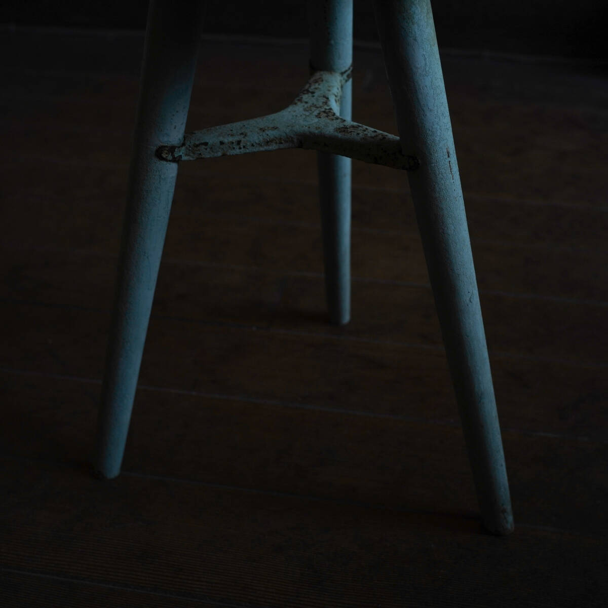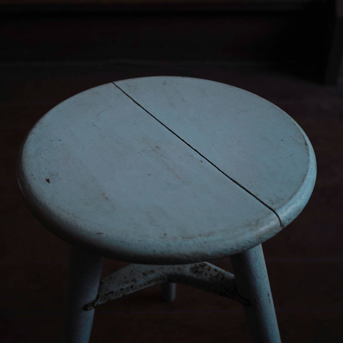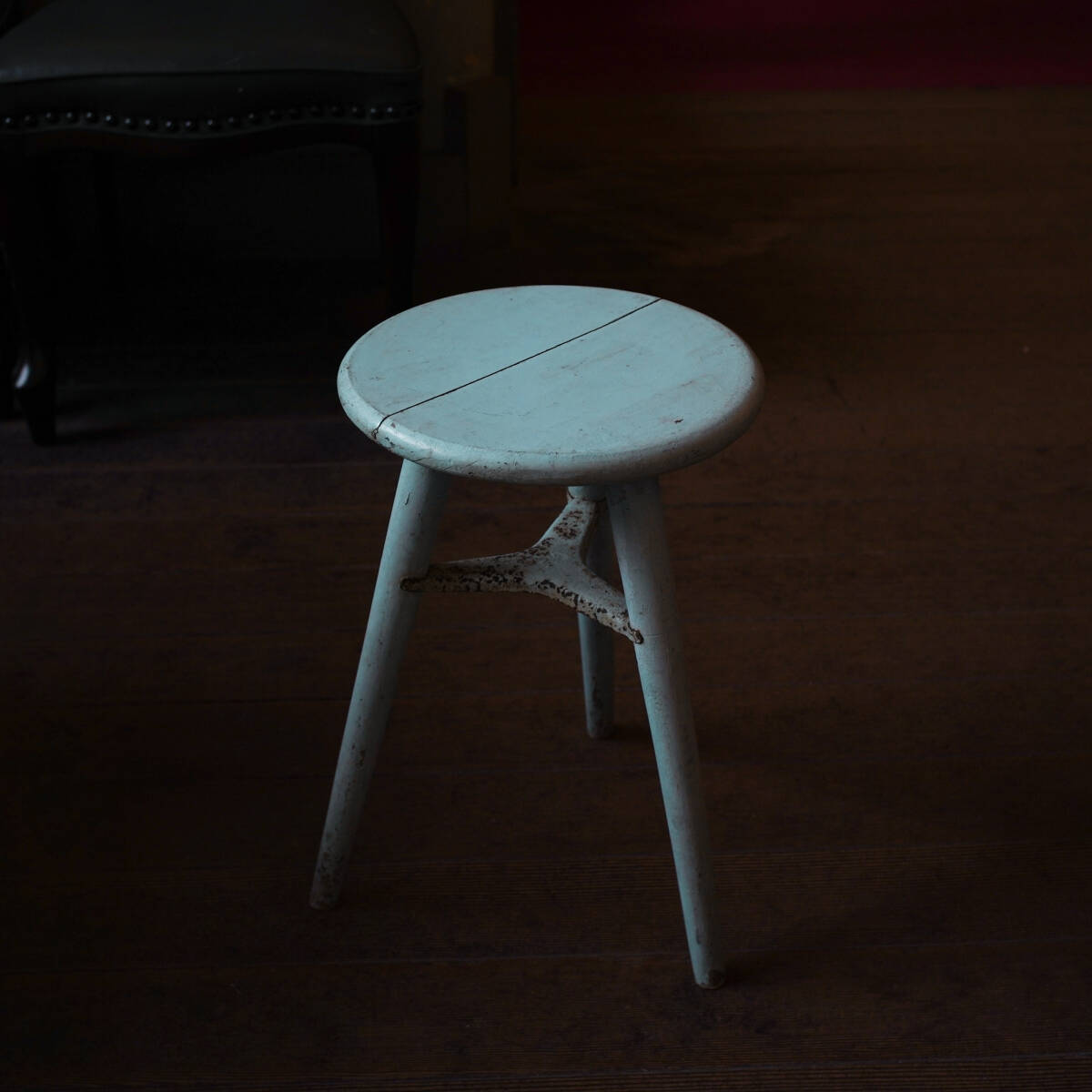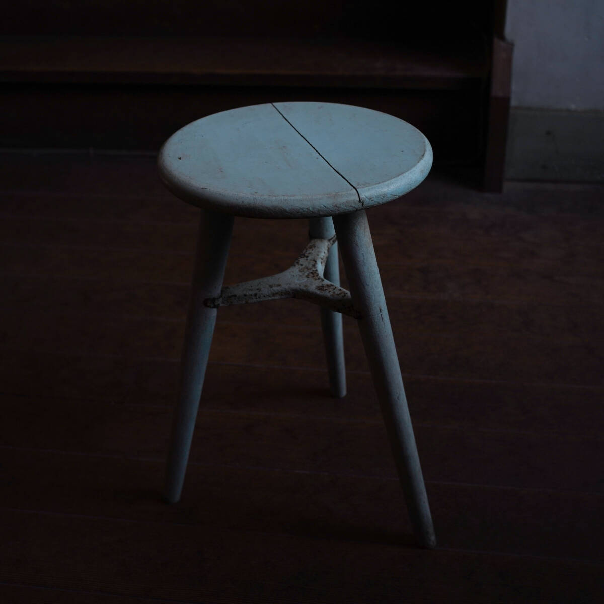 古いスツールとしては人気のあるモデルですが、経年変化によって柔らかな表情となった水色ペンキが味わい深く好ましいです。