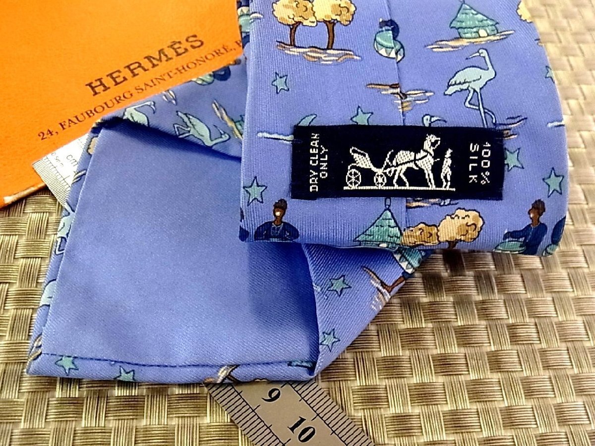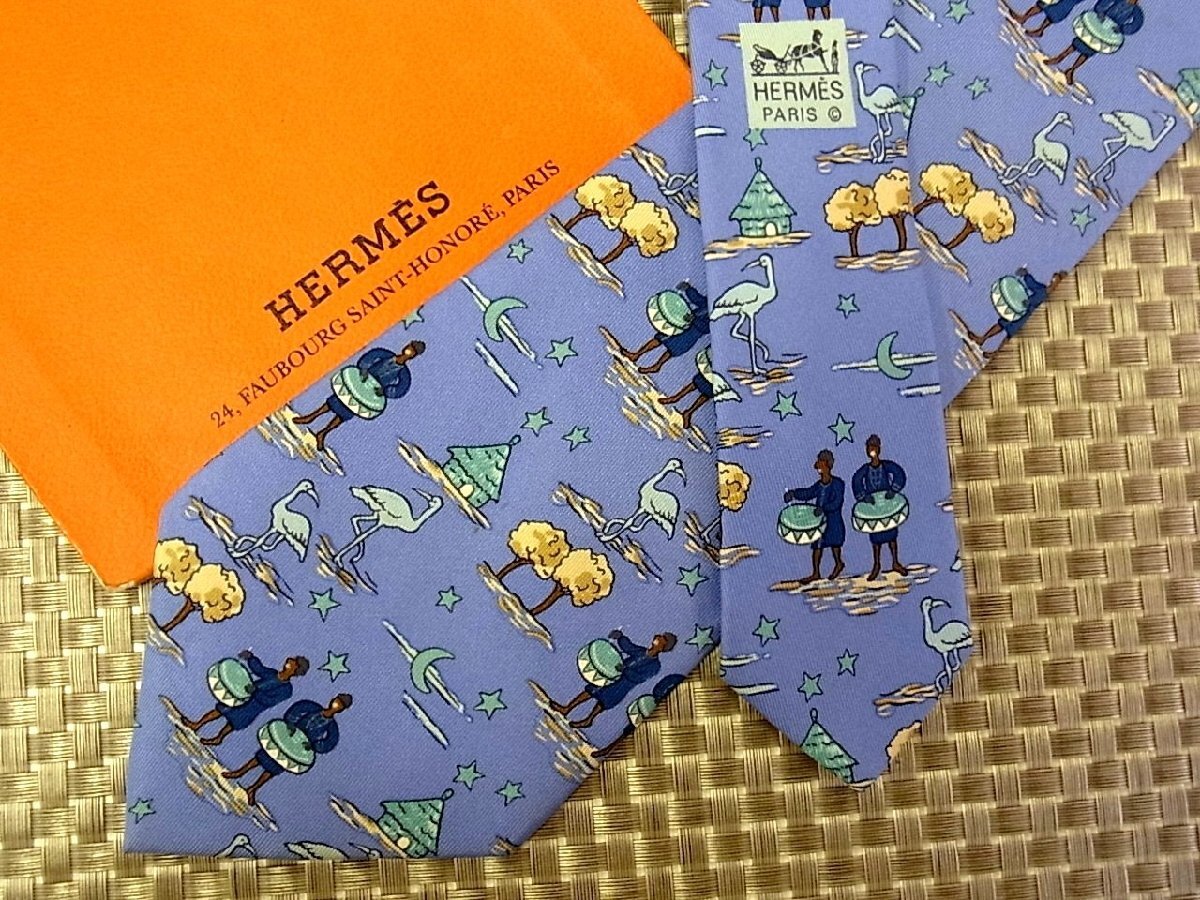 【在庫処分セール】●特売●FK9063●エルメス【人 太鼓 楽器 小屋 鳥 樹木 星 スター 柄】ネクタイ●