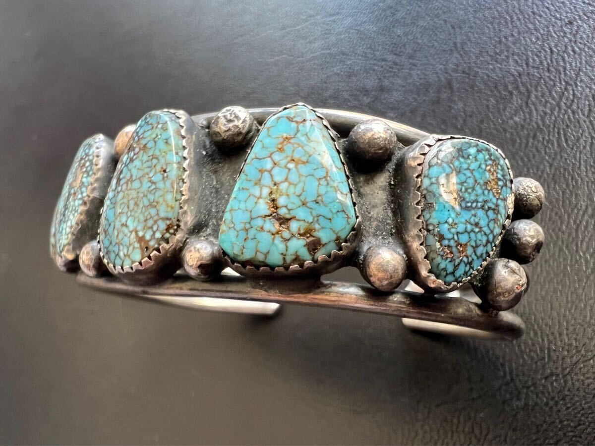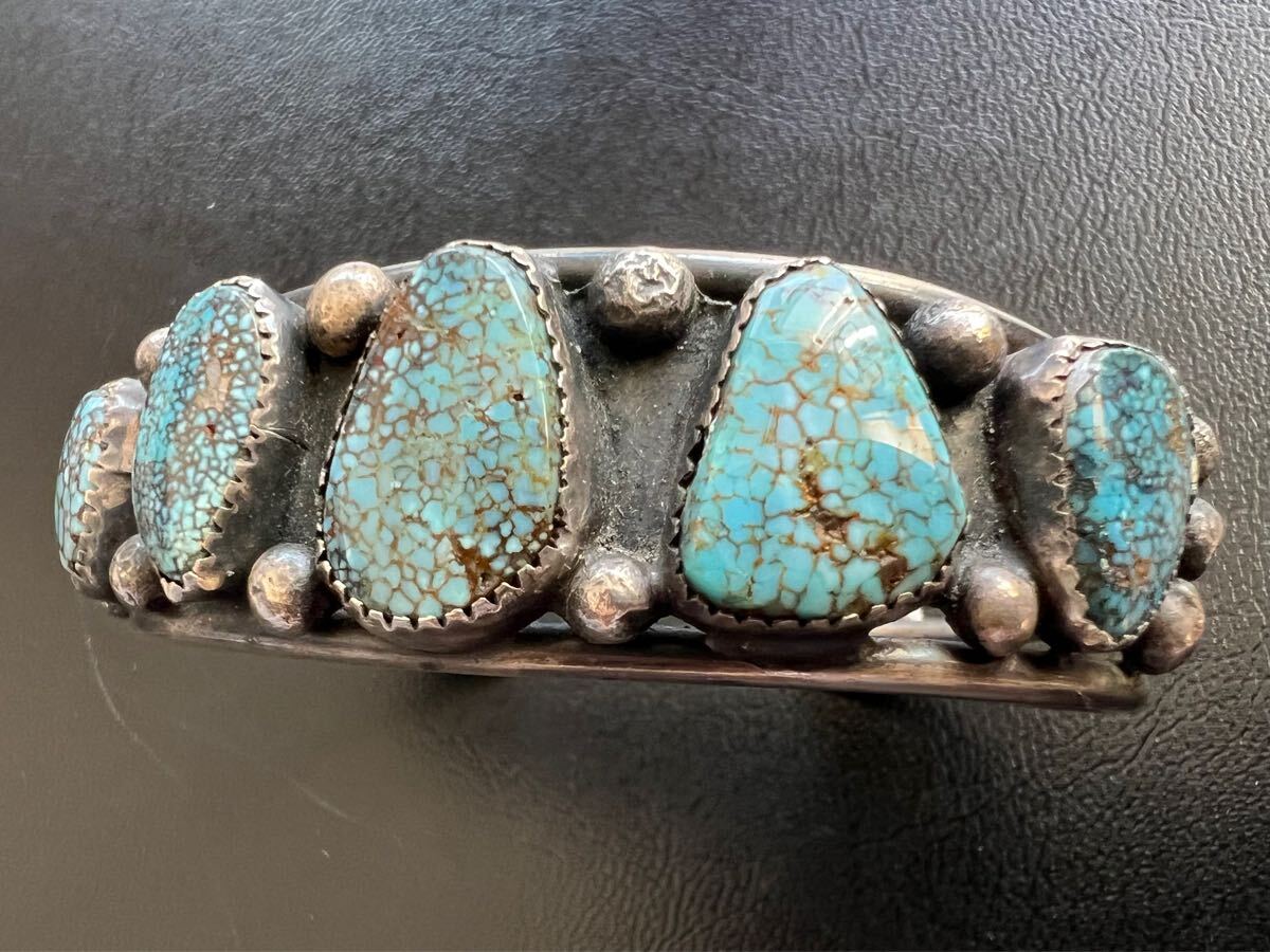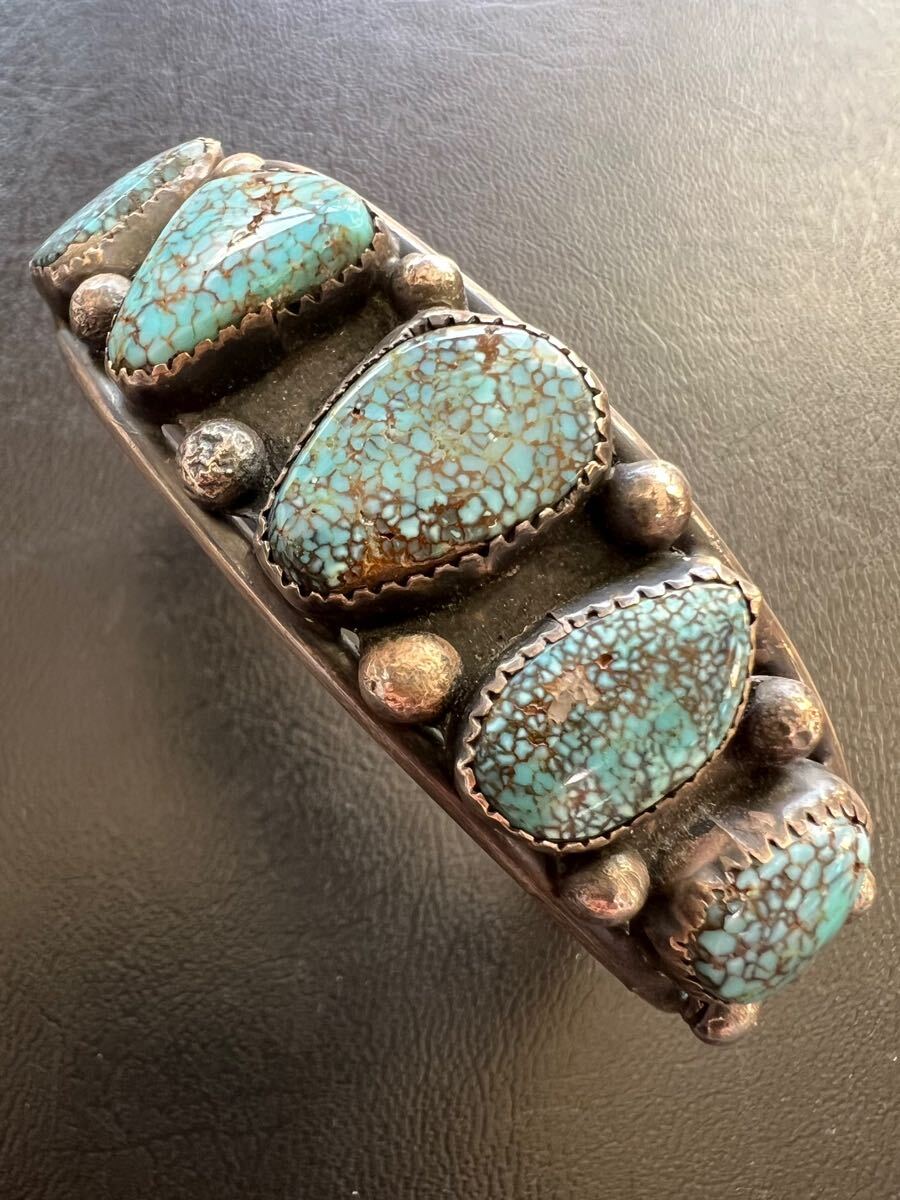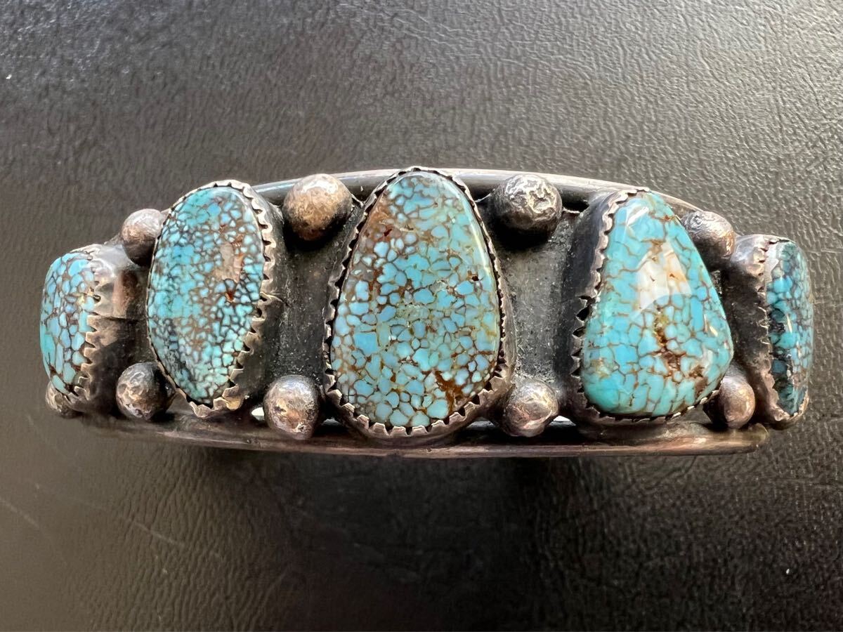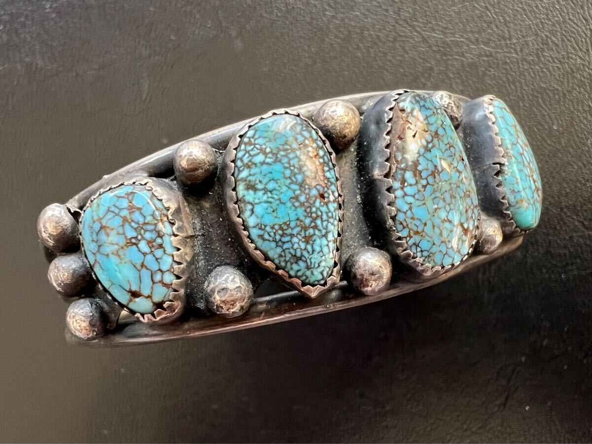 こちらのOLD PAWNの1960~70年代に制作された作品で、3本のアームにはスパイダーウェブの美しいネバダブルー・ターコイズを5個セット、シンプルながらとてもエレガントな、いにしえの存在感のある素晴らしいバングルになります。