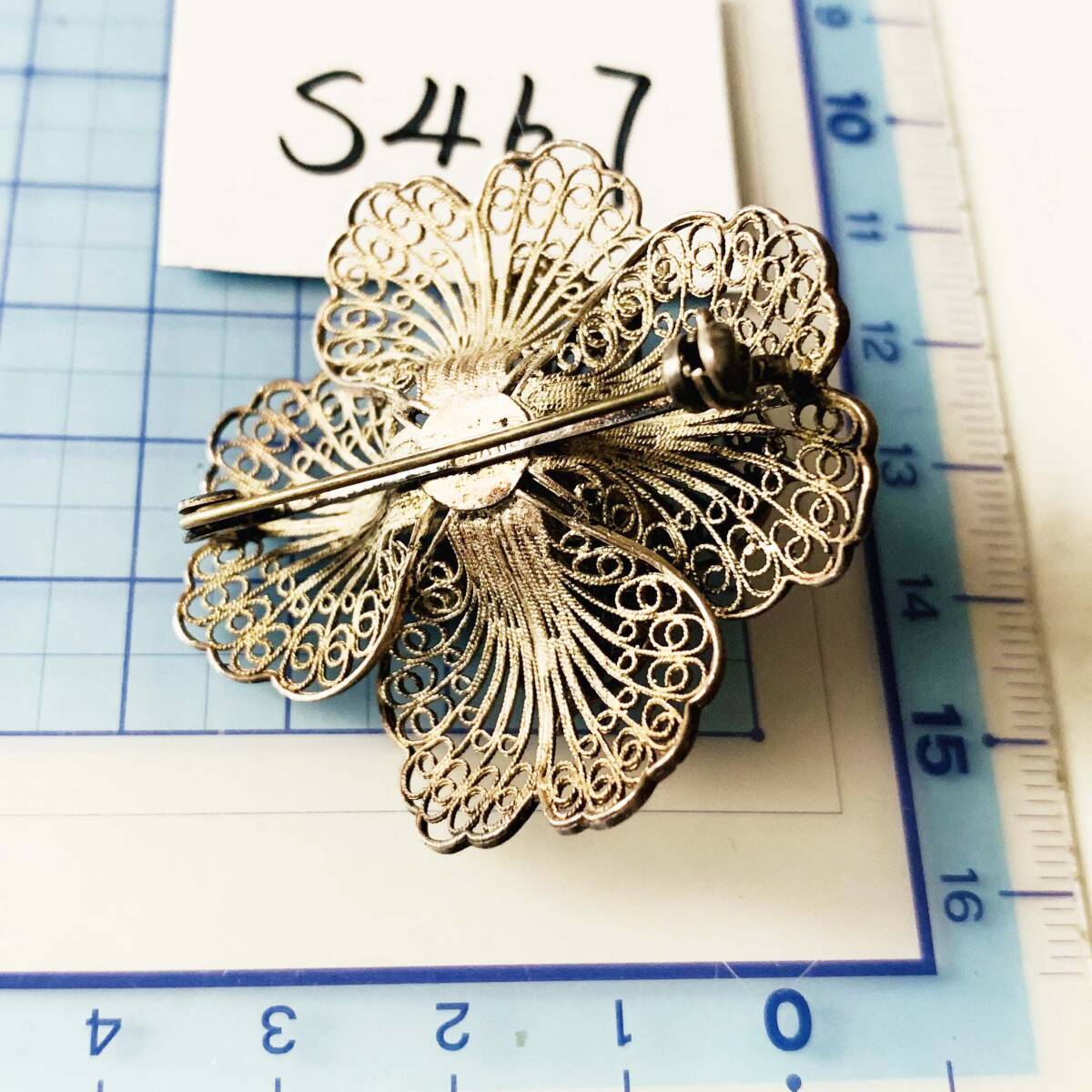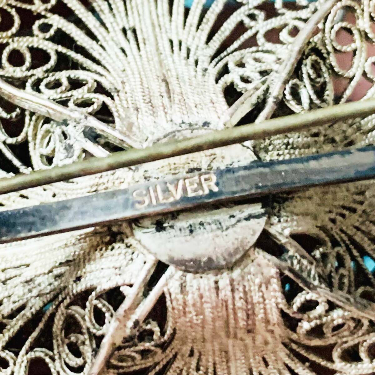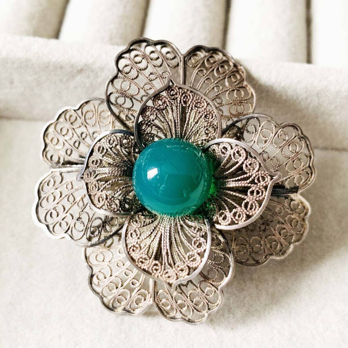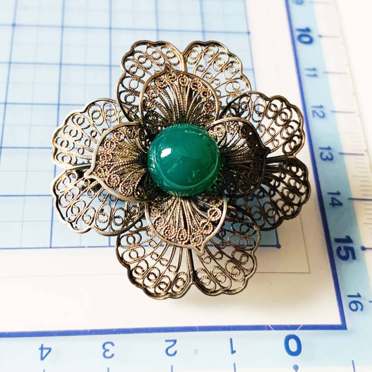 ヴィンテージ 天然瑪瑙 グリーン シルバー銀製 細工 ブローチ No.S467