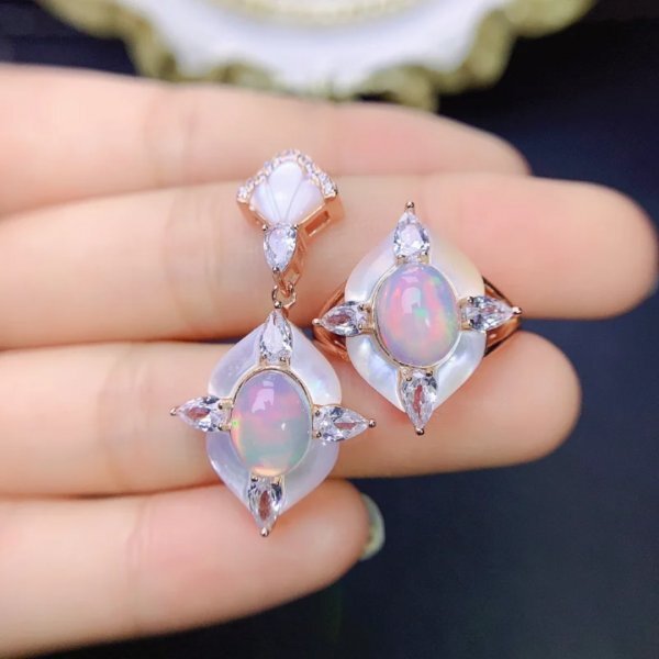 女性用925スターリングシルバーのオパールジュエリーセット(リング、ネックレス)、7x9mm、バースデーパーティー