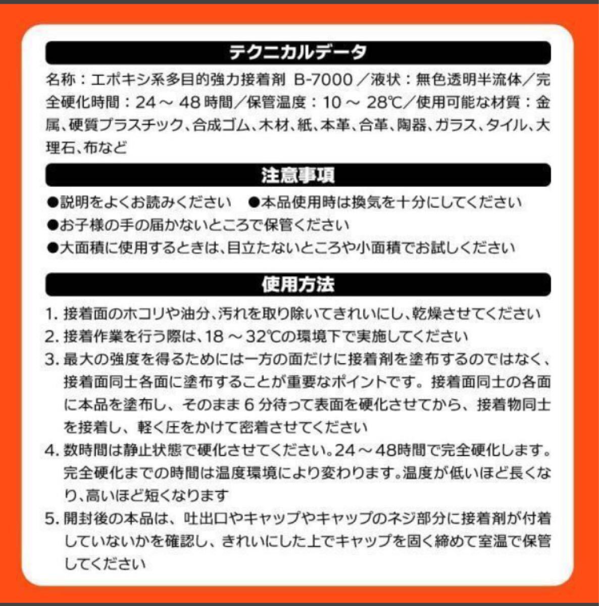 【商品ページを御覧頂きありがとうございます】画像を良く御確認 御覧頂き 御理解の上で入札をお願いします。商品整理の為 B-7000接着剤の出品になります。この商品は新品未使用品ですが保証は有りません【容量】110ml【本数】1本。 この商品を購入した際の商品説明内容はB-7000は携帯電話のフレーム修理(主に個人的な目的)ガラス プラスチック 革 木材 布 その固体含有量の主要な選択です。硬化時間と粘度により 優れた接着剤となりますとの事です。この商品は新品未使用ですが 1度は人手に渡った商品ですので この商品に対して少しでも不安の有る方や完全完璧を求める方は入札を御遠慮下さい。【配送方法】定形外規格外390円。レターパックプラス600円。[注意事項]定形外規格外は追跡も出来ませんし紛失 や破損 輸送事故が有っても保証は出来ません。レターパックプラスは追跡は出来ますが紛失や破損 輸送事故が有っても保証は出来ません。送料は元払いのみとなります。代引きでの取り引きは出来ません。発送は入金確認後とさせて頂きます。土日及び祭日は郵便局がお休みの為発送は出来ません。休み明け発送となります【決済方法】ヤフー簡単決済【注意事項】落札後はノークレームノーリターンノーキャンセルでお願いします。落札後取引ナビにて24時間以内に取り引き連絡が出来ない方や3日以内に入金が出来ない方は入札を御遠慮下さい