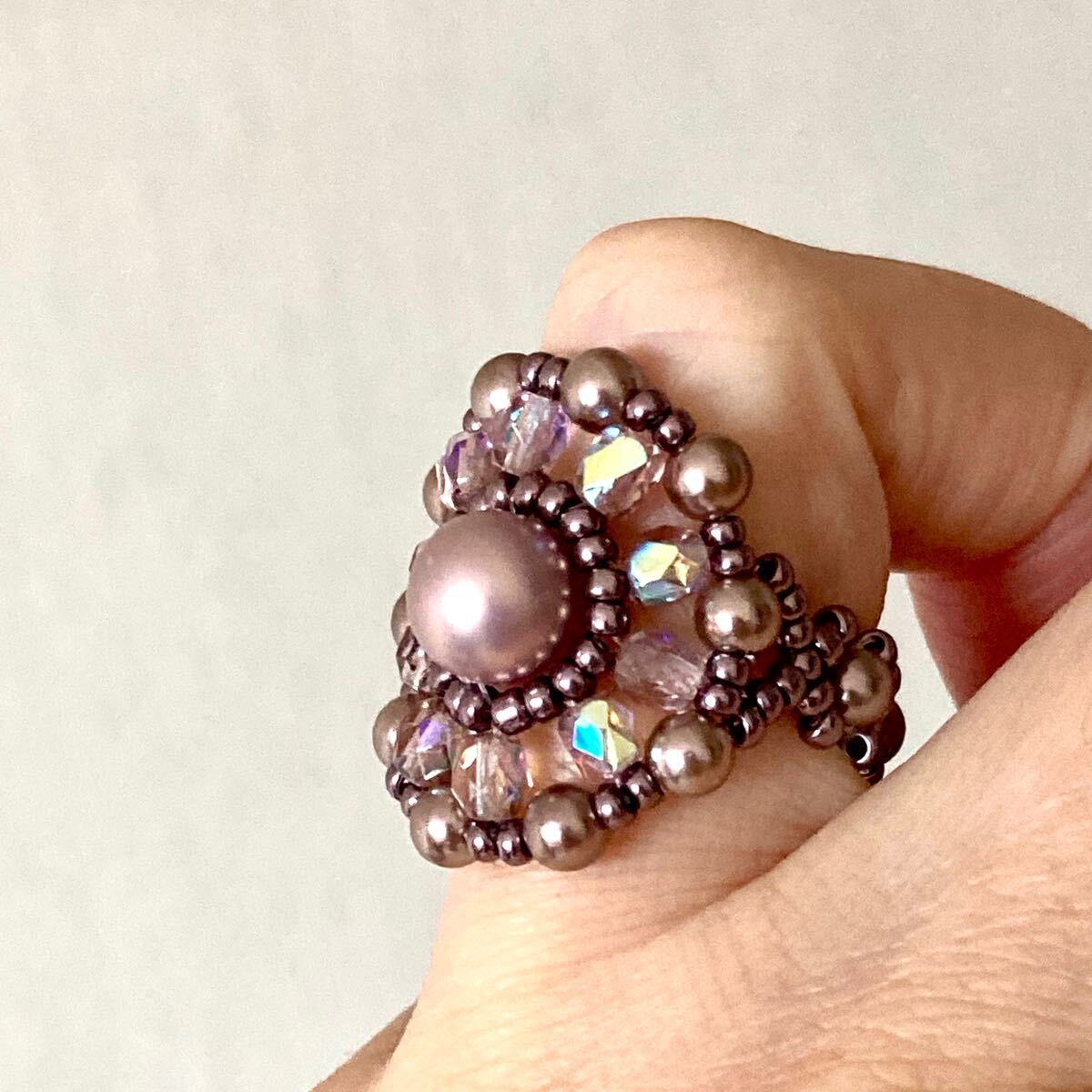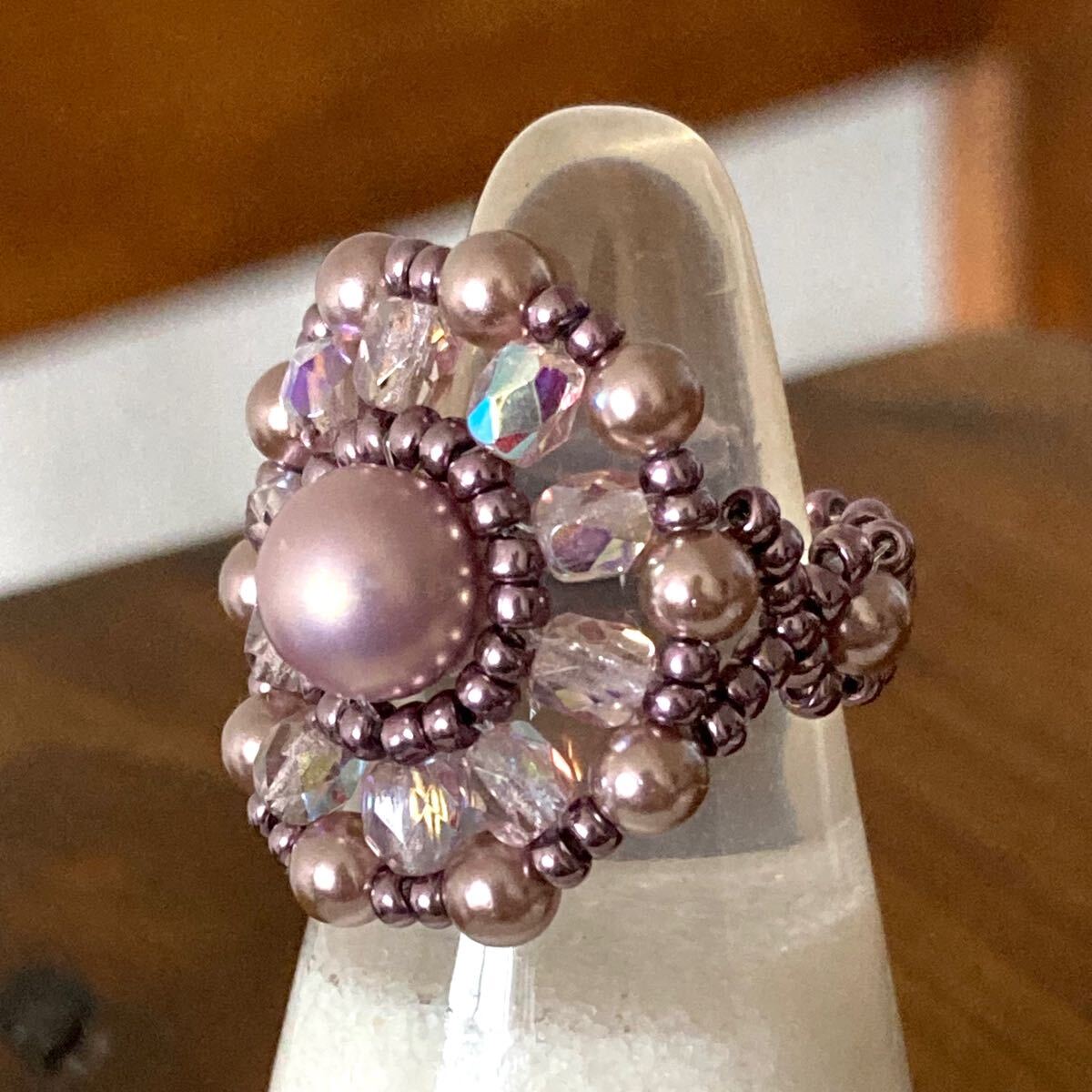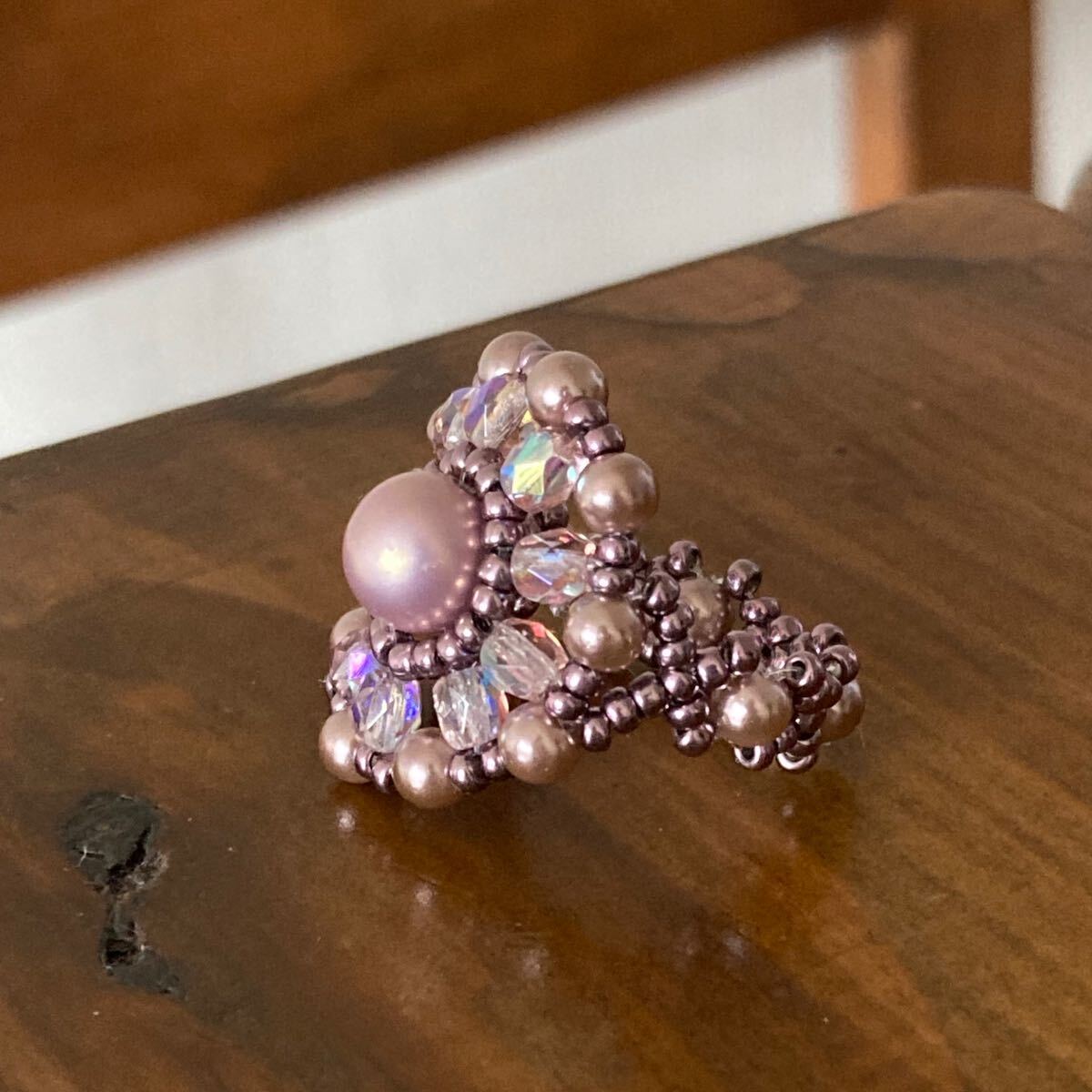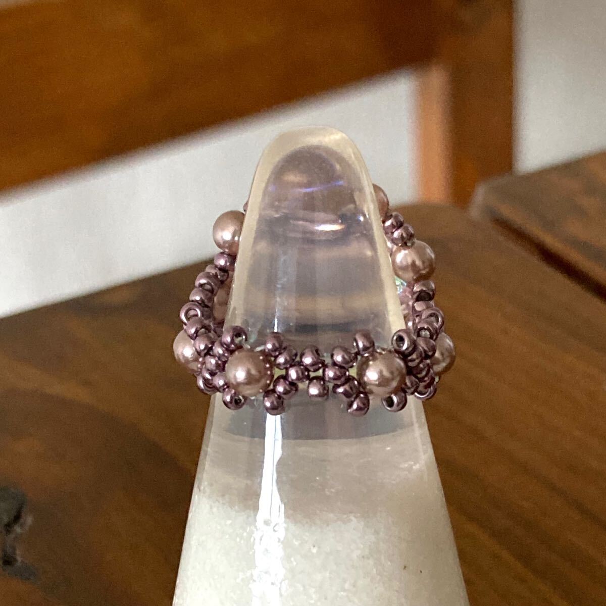 6mmと4mmの薄いパープルピンクのパールビーズ、4mmのクリアピンクのチェコビーズ、メタリックパープルの丸小ビーズで作ったリングです。
