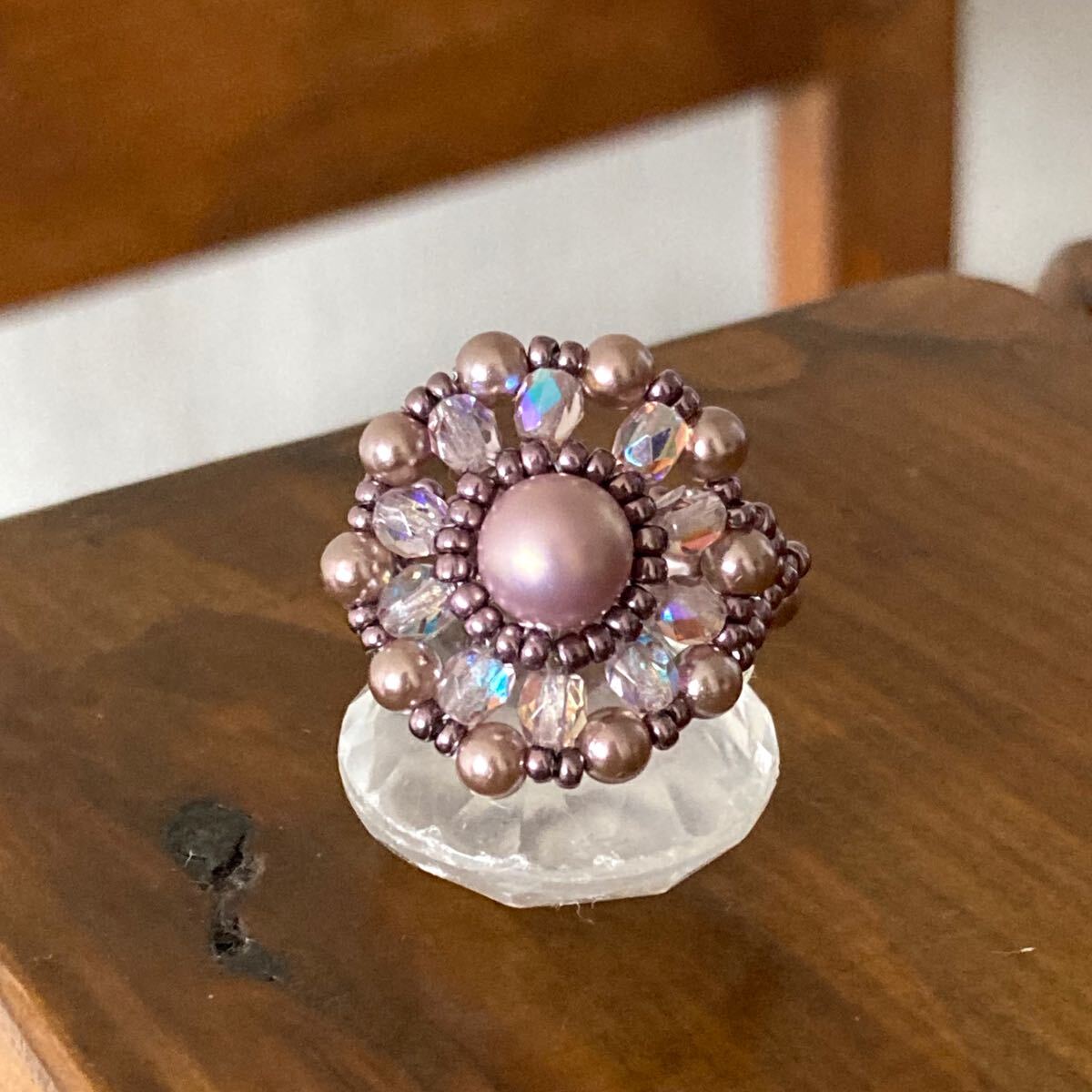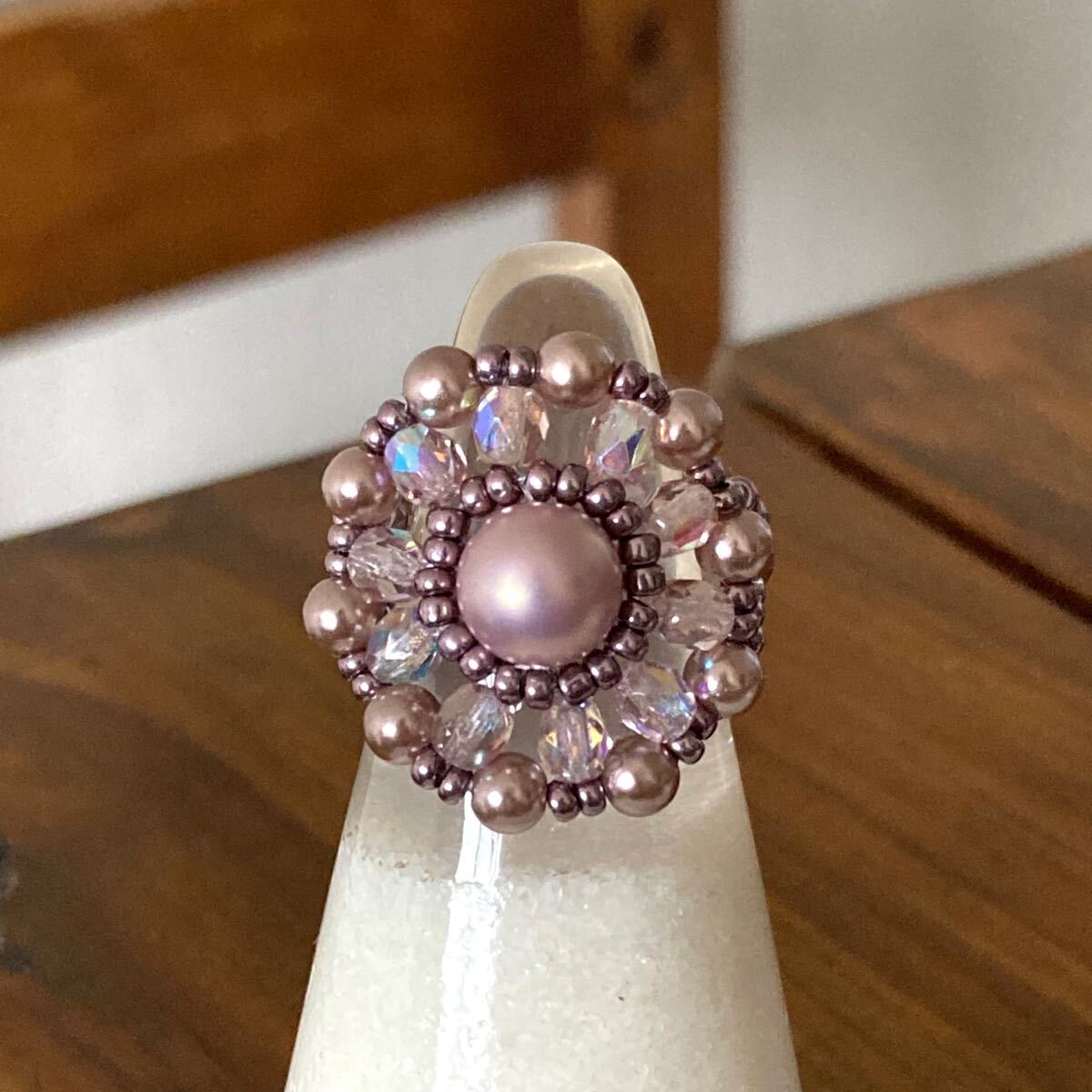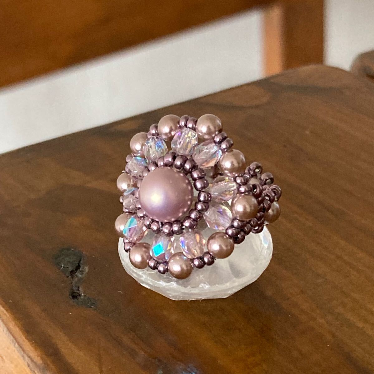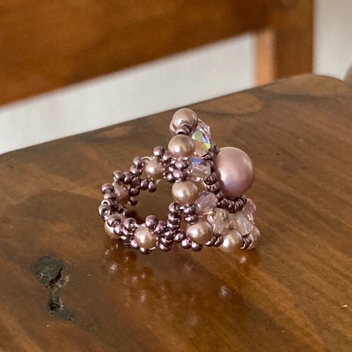 6mmと4mmの薄いパープルピンクのパールビーズ、4mmのクリアピンクのチェコビーズ、メタリックパープルの丸小ビーズで作ったリングです。
