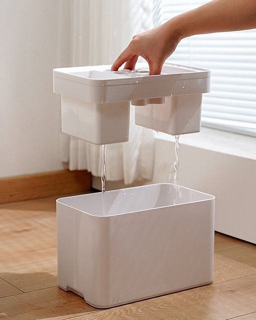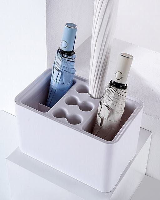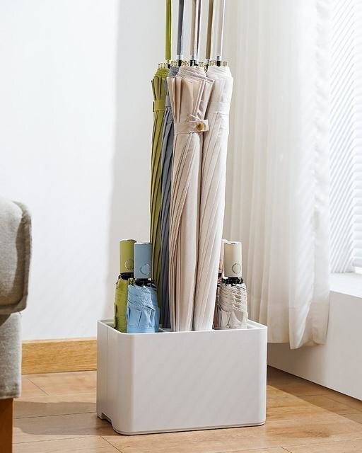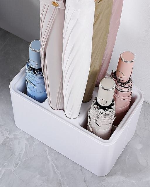長方形でピタッと角置きも可能です。玄関の外のちょっとしたスペースに置けて邪魔になりません。 折り畳み傘は下の穴から、長傘は差したところから直接下へ排水できます。 本体部とトレー部は取り外しができるので雨水を流しやすく、丸洗いも可能です。