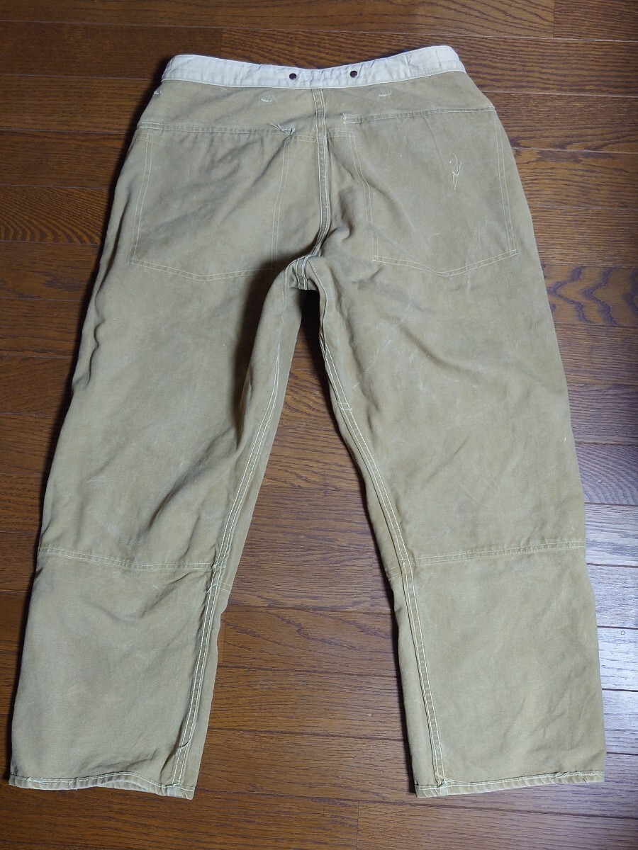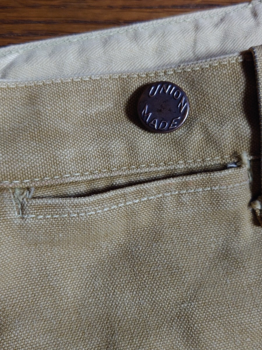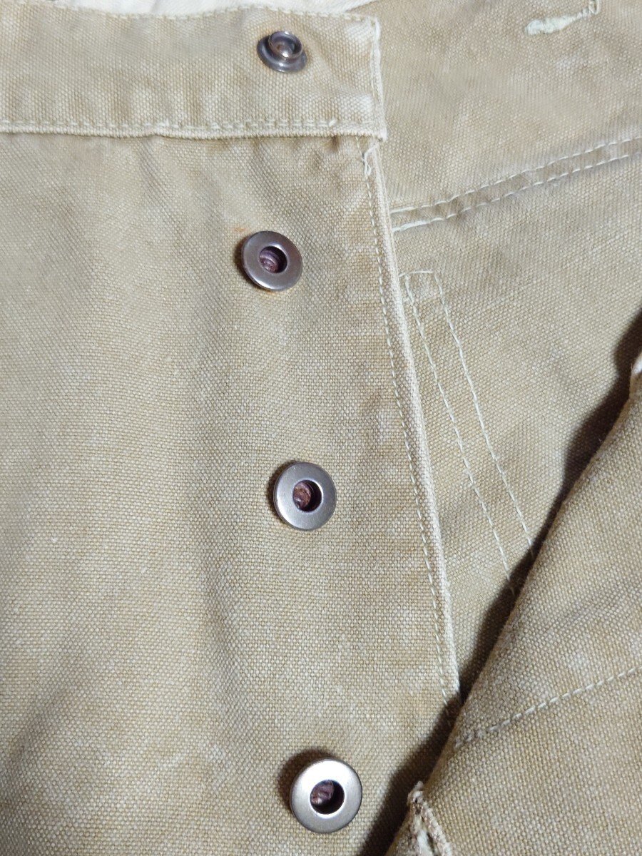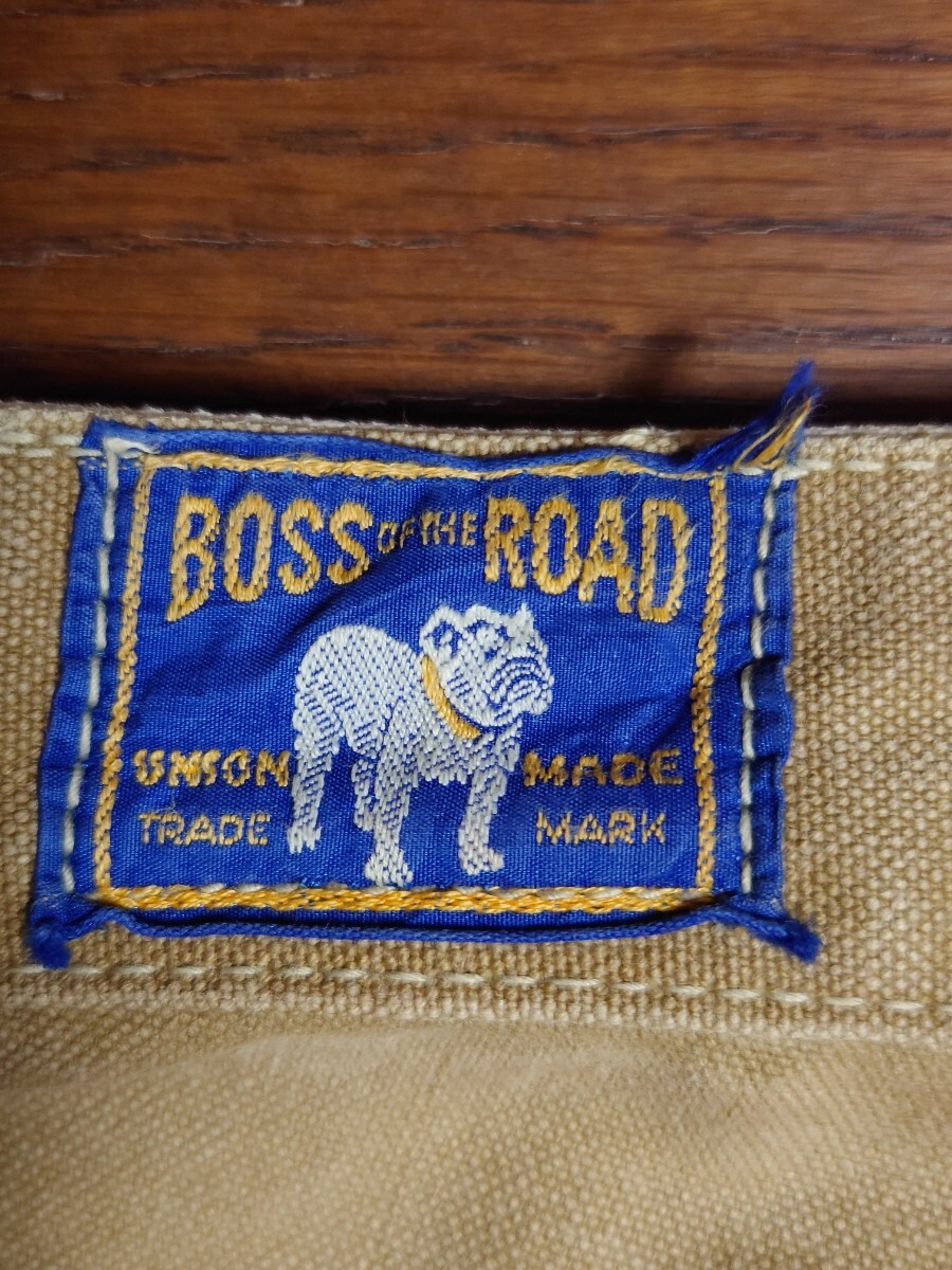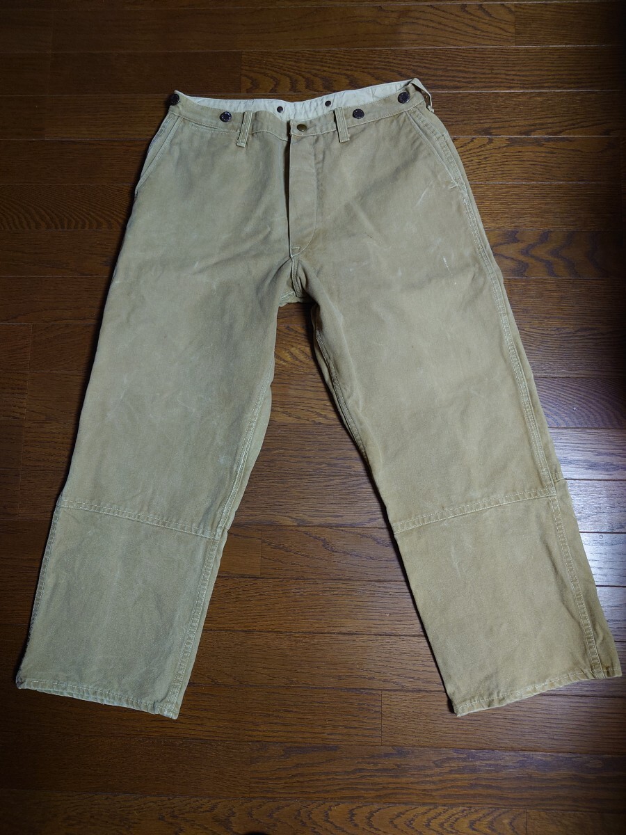 タンスの奥に眠っていたものです。10〜15年前に入手したものです。着用したのは草刈りの際に数回程度だったかと思います。洗濯してずっと仕舞っていたものです。40'sヴィンテージ ボスオブザロード BOSS OF THE ROAD のブラウンダックダブルニーワークパンツです。膝より上の生地が二重になってます。股部は三角マチ付きです。ワークパンツは用途的にある程度履き潰されているものが多いなか、なかなかのグッドコンディションです。ウエスト部はベルトループ6本とユニオンメイドのサスペンダーメタルボタン6個で、裏地にヘリンボーン生地が付いてます。トップボタンがスナップボタンのボタンフライは2番目以降がドーナツボタンで3個です。後ろポケット内にユニオンチケットもついてます。フロント右コインポケットもついてます。キャントバステム CAN'T BUST EM等でも同仕様のワークパンツを見かけることがありますが、BOSS…はより少なく希少かと思います。着用したサイズ感は31インチぐらいです。ウエスト平置き41センチ×2、股下68センチですが、股上が深く総丈95センチぐらいはありますので股下75〜72センチぐらいの感じで着用できると思います。裾はチェーンステッチで、裾上げはしてないと思います。まだごわっごわの硬い生地です。馴染ませるまで時間が必要なコンディションです。ペンキ跡が少しと極小さな染み様の汚れはあります。また、ボタンフライのドーナツボタンは取付け部の金具に錆が出てます。糸抜けは少しはあるかもしれませんが、目視で破れほつれや穴は見当たりません。ワークパンツなのでエンジニアブーツ等と合わせてガンガン履けると思います。