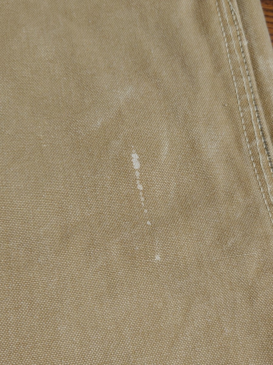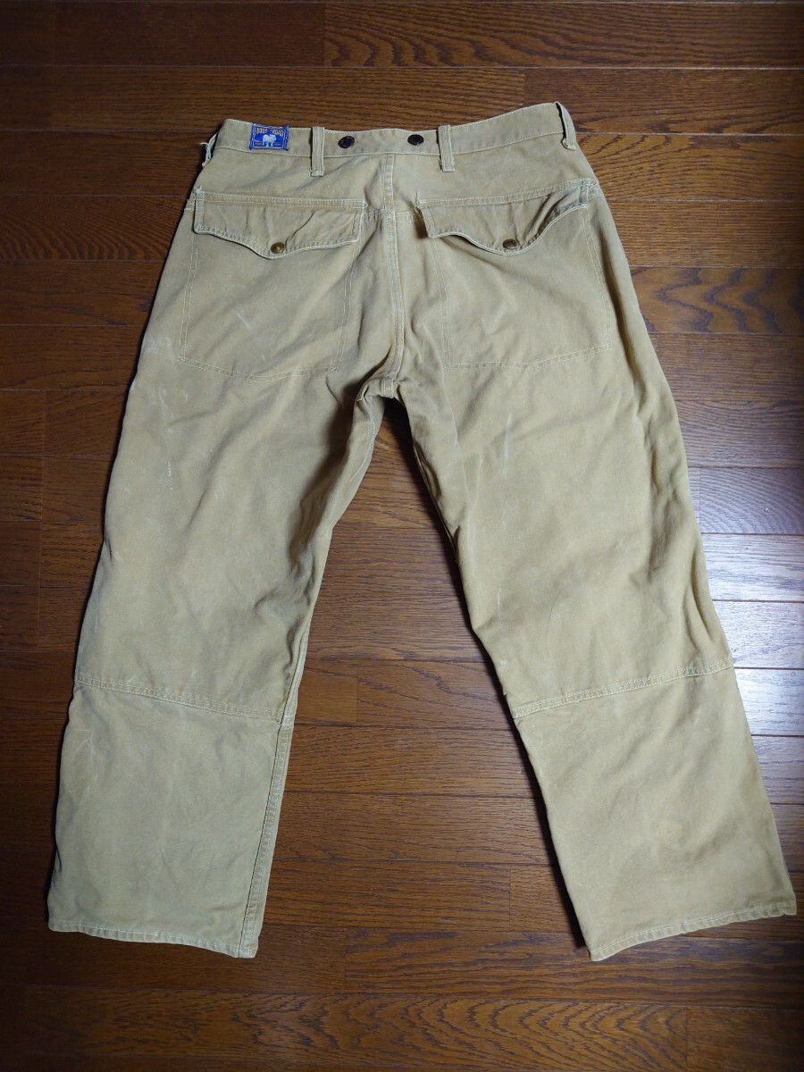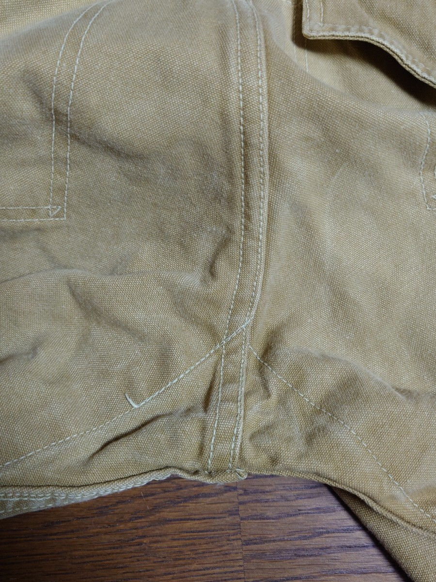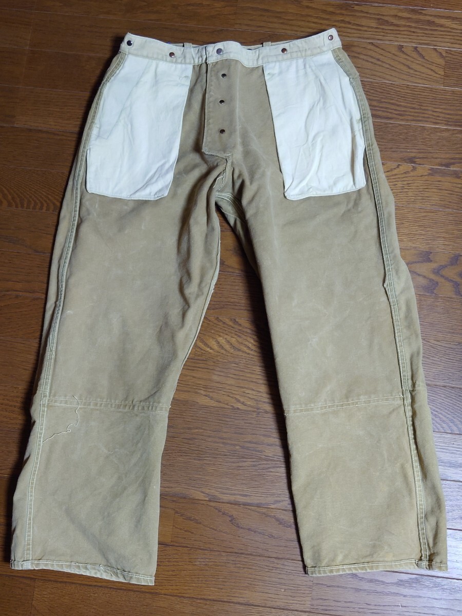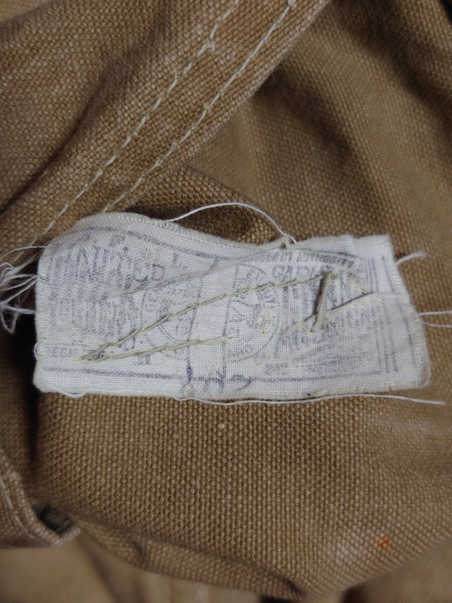 タンスの奥に眠っていたものです。10〜15年前に入手したものです。着用したのは草刈りの際に数回程度だったかと思います。洗濯してずっと仕舞っていたものです。40'sヴィンテージ ボスオブザロード BOSS OF THE ROAD のブラウンダックダブルニーワークパンツです。膝より上の生地が二重になってます。股部は三角マチ付きです。ワークパンツは用途的にある程度履き潰されているものが多いなか、なかなかのグッドコンディションです。ウエスト部はベルトループ6本とユニオンメイドのサスペンダーメタルボタン6個で、裏地にヘリンボーン生地が付いてます。トップボタンがスナップボタンのボタンフライは2番目以降がドーナツボタンで3個です。後ろポケット内にユニオンチケットもついてます。フロント右コインポケットもついてます。キャントバステム CAN'T BUST EM等でも同仕様のワークパンツを見かけることがありますが、BOSS…はより少なく希少かと思います。着用したサイズ感は31インチぐらいです。ウエスト平置き41センチ×2、股下68センチですが、股上が深く総丈95センチぐらいはありますので股下75〜72センチぐらいの感じで着用できると思います。裾はチェーンステッチで、裾上げはしてないと思います。まだごわっごわの硬い生地です。馴染ませるまで時間が必要なコンディションです。ペンキ跡が少しと極小さな染み様の汚れはあります。また、ボタンフライのドーナツボタンは取付け部の金具に錆が出てます。糸抜けは少しはあるかもしれませんが、目視で破れほつれや穴は見当たりません。ワークパンツなのでエンジニアブーツ等と合わせてガンガン履けると思います。