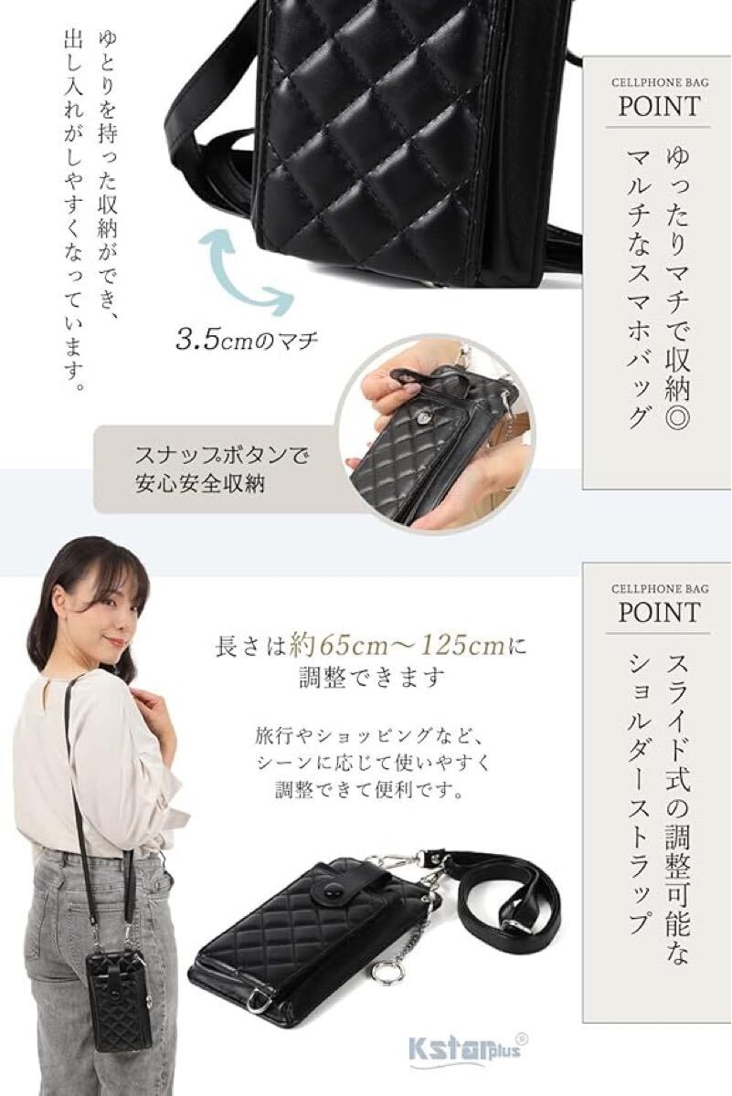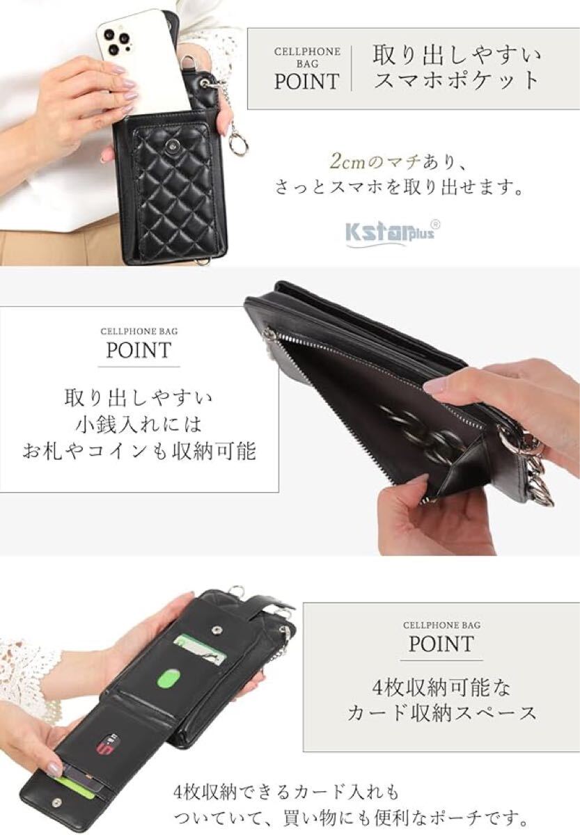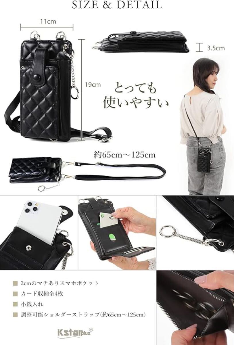 [サイズ・内容詳細] スマホポーチ レディース:縦:19cm、横:11.2cm、厚さ:3.5cm、重さ:160g、素材:高品質合成皮革素材、2cmのマチありスマホポケット、カード収納全4枚、小銭入れ、調整可能ショルダーストラップ(約65cm~125cm~125)