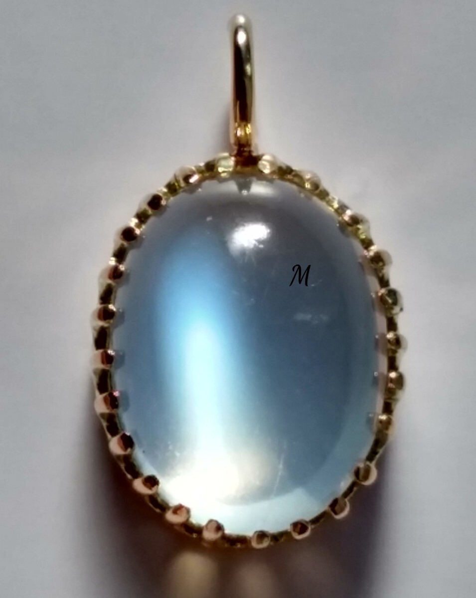 センターにやや太めのキャッツアイ様の淡青色のアデュラレッセンス(ムーンストーン特有のシラー、キャッツアイのソーティングはなし)が出ます。