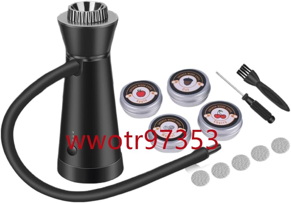 製品説明 付属品一式: 1* スモーカー、1* おがくず、1* ホース、1* ブラシ、1* ドライバー、5* フィルター、1* 取扱説明書 + クルミウッドチップ 1 ボトル + リンゴウッドチップ 1 ボトル +チェリーのおがくず 1 ボトル + オークのおがくず 1 ボトル