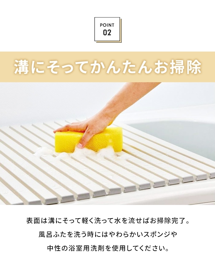 | Ag抗菌シャッター式 風呂ふた。 〔POINT〕Ag抗菌加工&防カビ加工 繋ぎ目にAg+銀イオン抗菌加工が施してあり、菌やカビによる嫌なヌメリの繁殖を抑えて風呂ふたをきれいに保ちます。 〔POINT〕毎日のお風呂掃除が簡単に 表面の溝に沿って軽く洗って水を流せばお掃除完了。 (風呂ふたを洗う際は柔らかいスポンジや中性浴室用洗剤を使用してください。) 〔POINT〕くるくる巻いてすっきり収納 浴室にひろげている風呂ふたをくるくる巻くだけのシャッタータイプ。 クルッとまとめられるので収納スペースが少ないお風呂場にぴったり。 〔POINT〕軽量設計 毎日使うものだから軽量でストレスフリーな使い心地。 軽量なのでお子様からお年寄りの方でも簡単に扱えます。 〔POINT〕安心・安全の日本製。 【使用上のご注意】 ◎購入直後は折りたたみクセが残っていることがありますが、徐々に解消していきます。 ◎24時間風呂ではご使用をお避け下さい。 ◎風呂水洗浄剤(塩素殺菌剤)をご使用しないでください。 ◎柑橘類(柚子・みかん・レモンなど)を使用しますと風呂ふたを傷める恐れがあります。 ◎ベビーバスなどを風呂ふたに乗せて使用しないでください。 |
