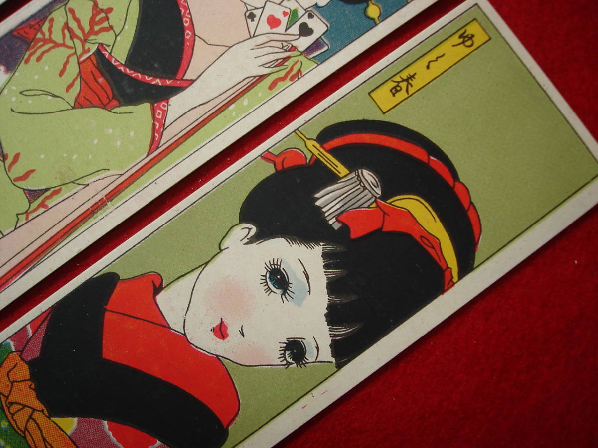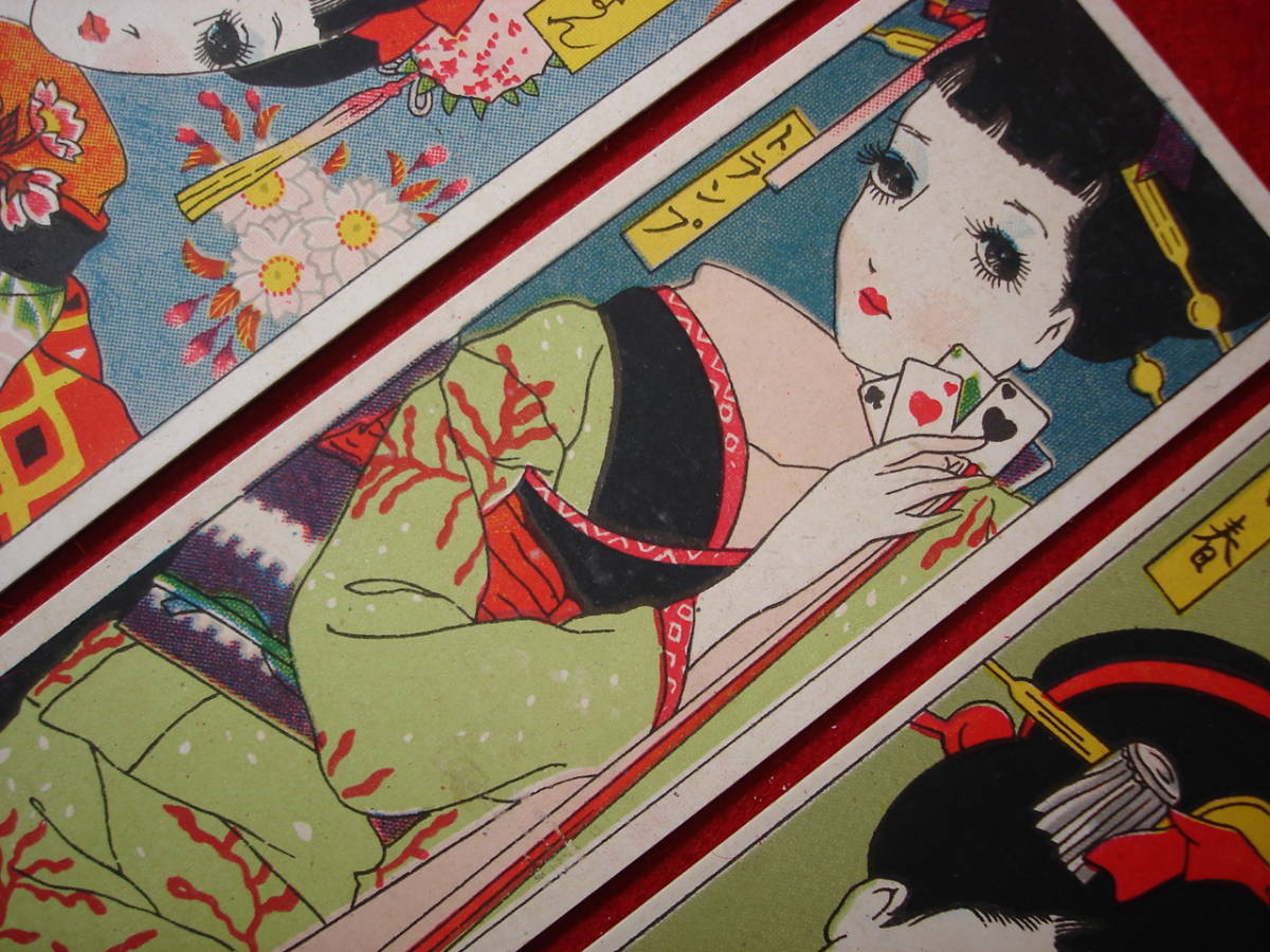 これは、3枚組の美人画版画で、舞子や芸子をモチーフにしています。未使用の新品で、長期間保管されていたため、多少の経年変化があるかもしれません。薄いパラフィン紙で包まれており、栞やブックマークとしても使用できるデザインです。各作品には題名が付けられています。インテリアや小道具としてもおすすめです。価格は950円から入札が始まっているようです。興味深いアンティーク作品ですね!専門家では御座いませんので、ご質問等にお答出来ない事もありますのでご理解願います。