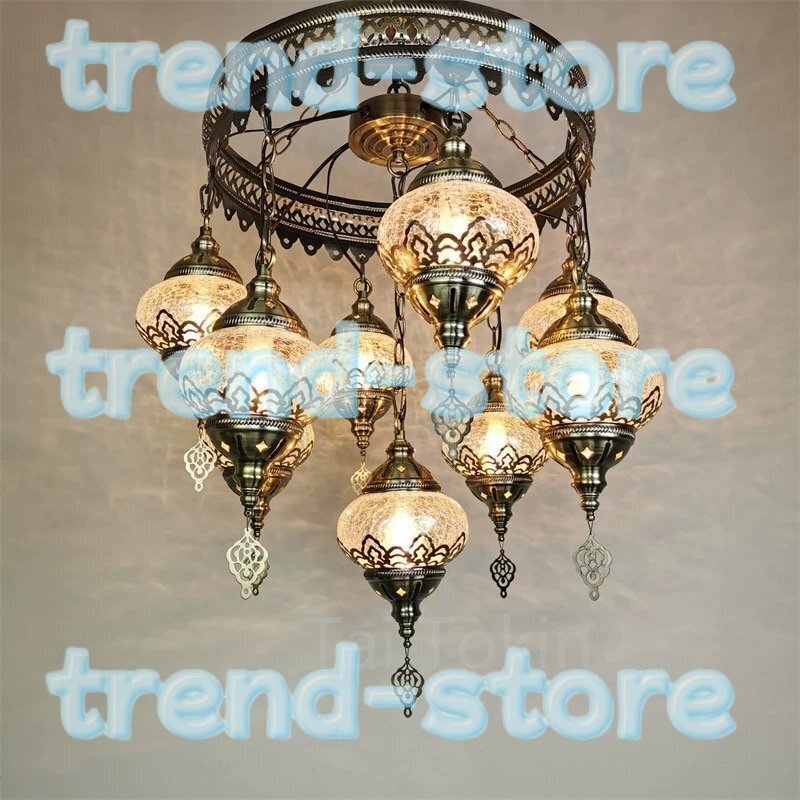 国内稀少! 9灯 手作りトルコランプ クラックガラス 直結タイプ 天井照明 南トルコ細工 シャンデリア インテリア