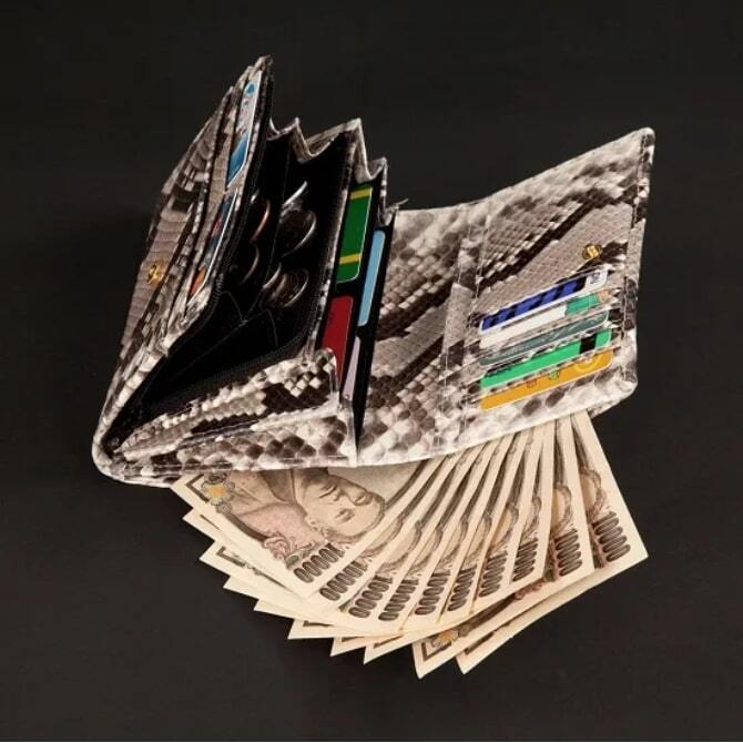 開運祈願 本革パイソン 2つ折り財布は、機能性にも優れています。2つ折り構造により、お札、コイン、カードをしっかりと整理できる収納スペースが充実しており、使い勝手は抜群です。また、コンパクトなサイズ感で持ち運びも非常に便利です。このアイテムで、スタイリッシュかつ機能的なライフスタイルを心ゆくまでお楽しみください!