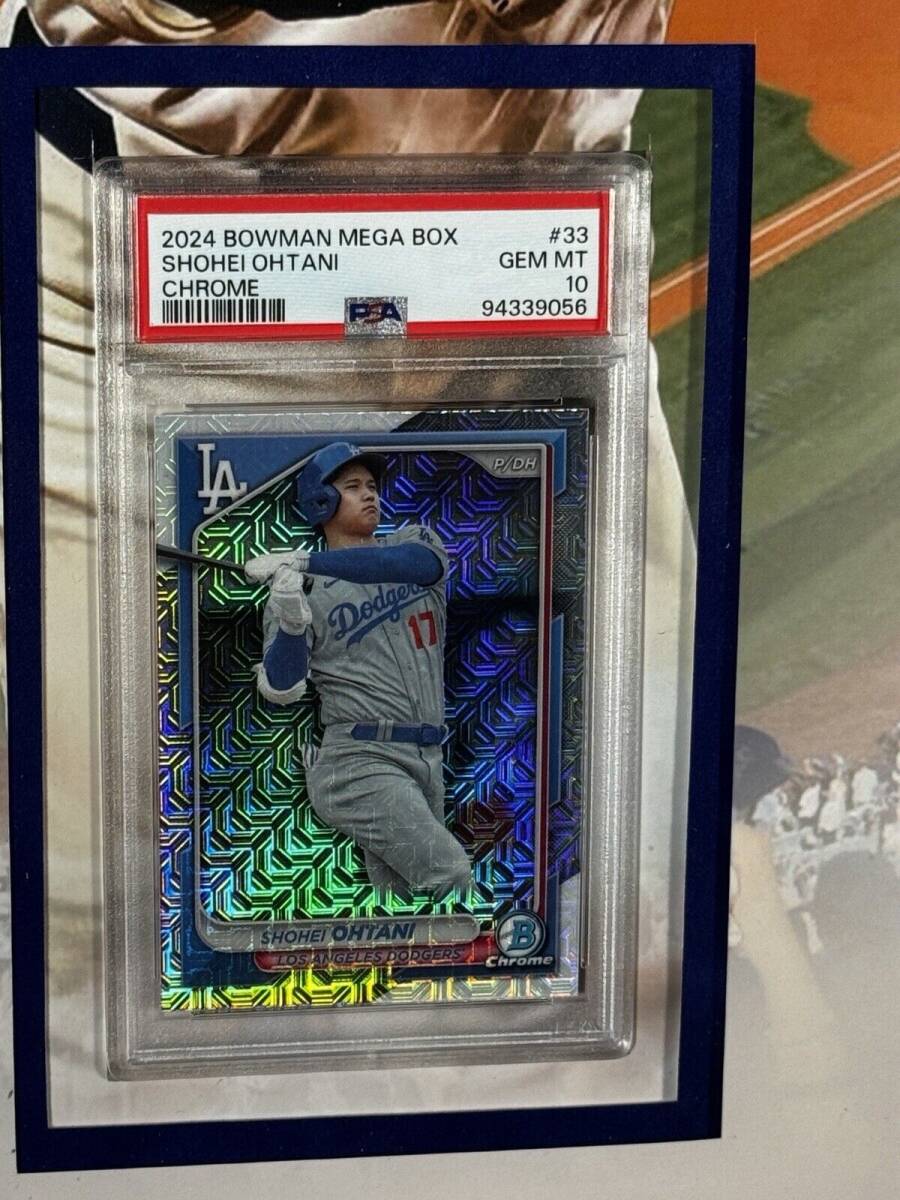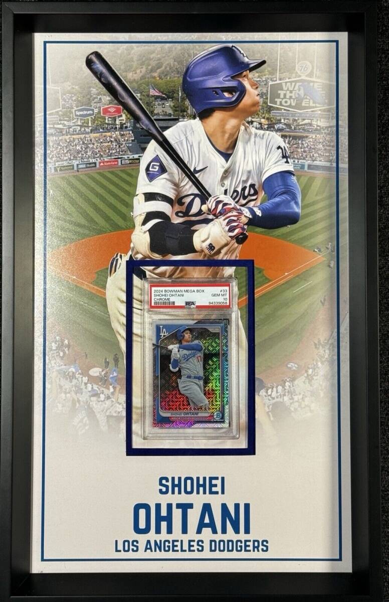 ドジャースのスター選手、大谷翔平の2024年ボウマン・クローム・メガボックス #33 PSA 10グレードのトレーディングカードが、カスタムフレームに入れて販売中です。