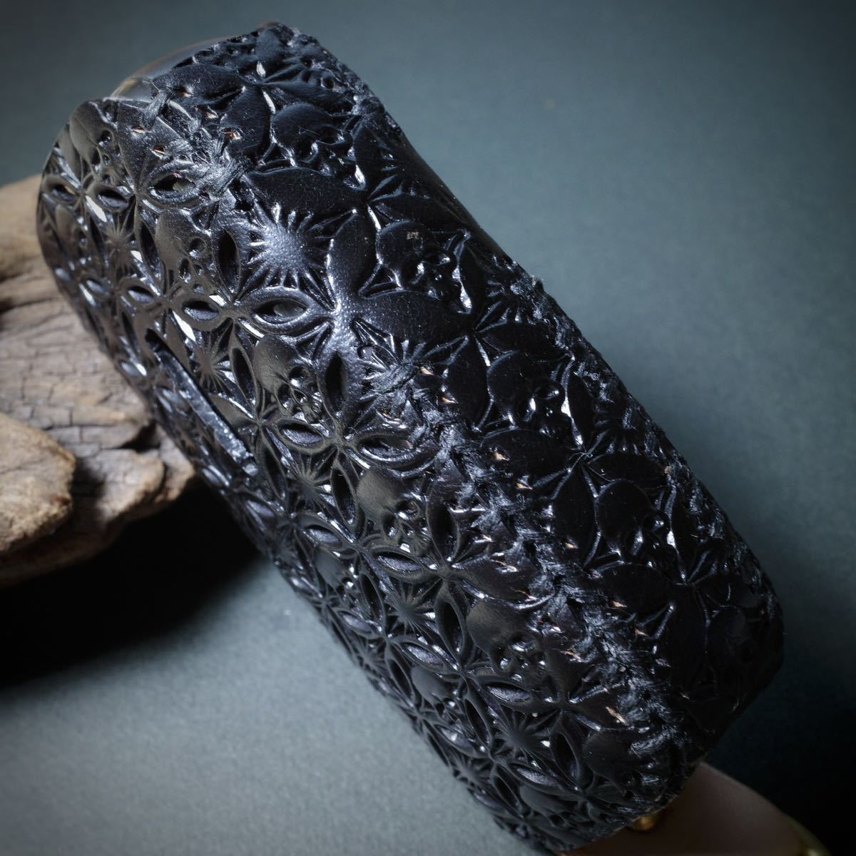 パーツを切り出し、全面に丁寧に刻印した後、カバーをしていても本体の色を活かせる透かし彫りを施しています