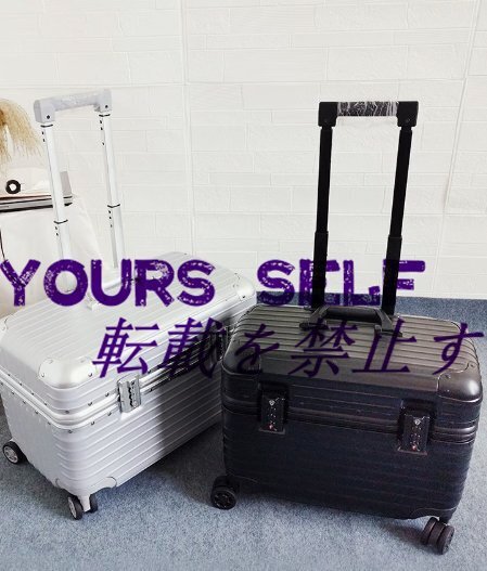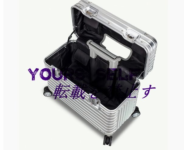 ★状態:新品未使用 ●素材 :アルミ合金 ●裏地 :ポリエステル ●カラー :ブラック ●ロック :TSAロック ●外寸サイズ :17インチ 約43*21*34cm ●アルミニウムボディ 高品質のアルミマグネシウム合金ボディのスーツケース。優れている耐凹み性、耐食性と振動吸収性で耐久可能。 ●ダブルキャスター/計8輪 双輪キャスター(ダブルキャスター)配置。スムーズな走行を支え、静音性設計と360度回転も勿論。 ●TSAロック 世界基準施設TSAロックが搭載されていますので、施錠したままでキャリーケースを預けることが可能。 ●ご注意 1.サイズ詳細などの測り方は実寸サイズを測っているため、誤差がある場合がございます。 2.裏地の色は予告無しに変更になる場合がございますので、ご了承ください。