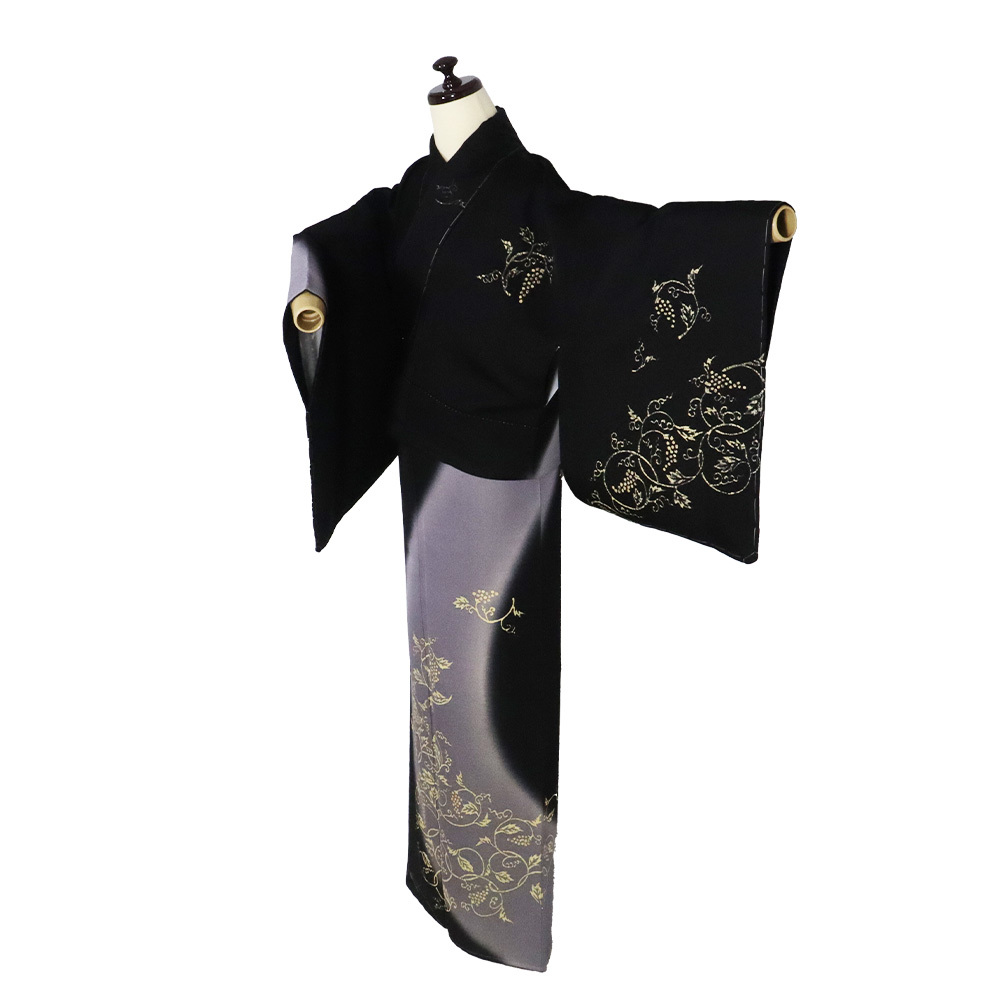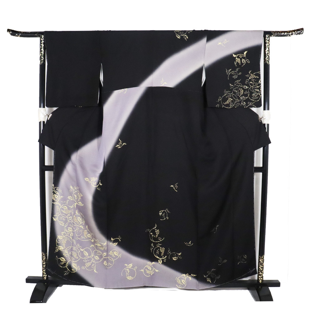 | 友禅訪問着 袷 丹後縮緬地 濃い紫(黒紅色)・渋い薄紫(薄色)暈し地 地割れ模様地 山ぶどう 166 広襟 新品 仕付け付き | |