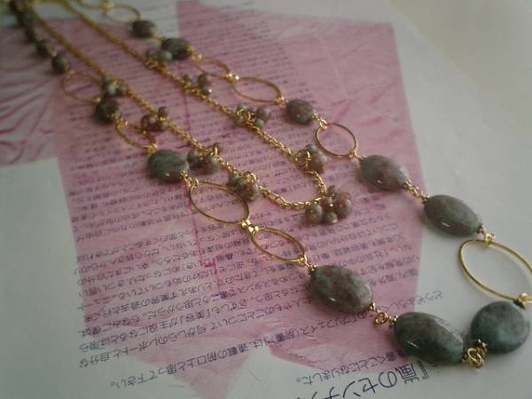 シベールのこだわり・・シリーズです♪大人色に惹かれて・・シックなグリーンガーネットのネックレス2点セットです♪繊細な色がアート仕様のグリーンガーネットが大人のロマンチックしています♪長い方のネックレスは18×13ミリ、14×10ミリのフラットオーバル、8ミリの丸玉のグリーンガーネットにデザインチャームを合わせました♪長さは全長93センチ位で調節自由です♪2連にされても素敵です♪短い方のネックレスは4ミリと6ミリの丸玉のグリーンガーネットを小花のように集めて可憐な表情です♪長さは45センチ+アジャスター12センチで最長57センチ位です♪それぞれ単品でも出品しています♪お揃いのブレスレットやイヤリングも出品しています♪♪シンプルで飽きのこないいつまでも着けられるデザインを考えて作りました♪ハンドメイドをご理解頂いてノークレーム、ノーリターンでお願いします