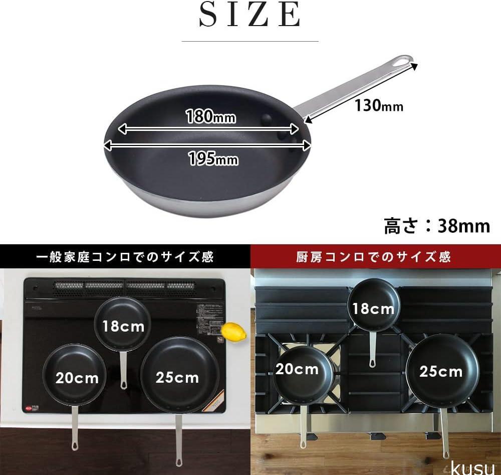 【サイズ】 内経Ф180(外径195mm)取手含まず 【厚み】 3.0mm 【高さ】 38mm 【重さ】 400g 【取っ手長さ】130mm