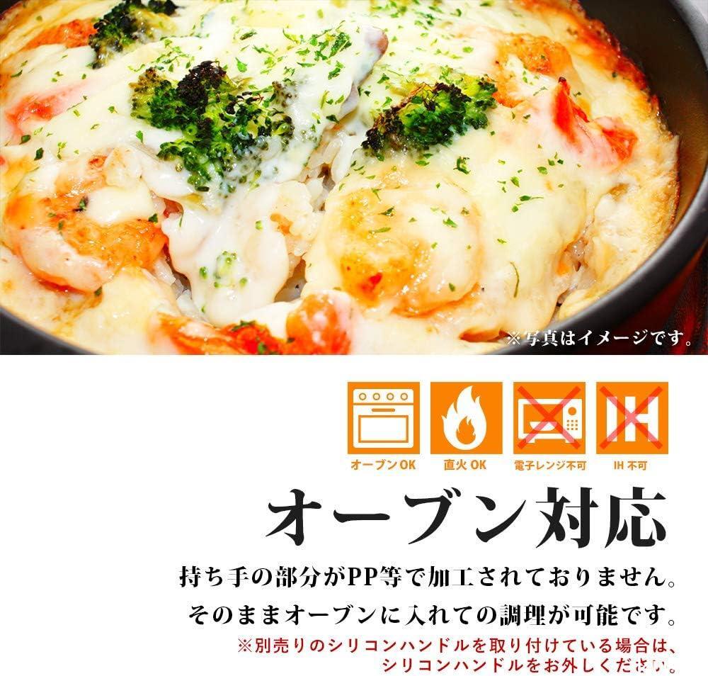 ※持ち手は鉄にメッキ加工を施し、高い耐久性を実現しました。 ※製造時期により持ち手の表面加工が異なります。同シリーズのフライパンをサイズ違いでお買い求めの際は、あらかじめご了承ください。 ※アルミは非常に傷が入りやすい柔らかい素材であるため、製造工程で付いた細かな擦り傷などがございます。品質上問題ありませんのでご安心ください。 ※IHには対応しておりません。 ※取っ手は熱くなります。布巾などをご利用頂くか、シリコンハンドル(別売り)をお買い求めください。オーブンで使用される際はシリコンハンドルは外してください。