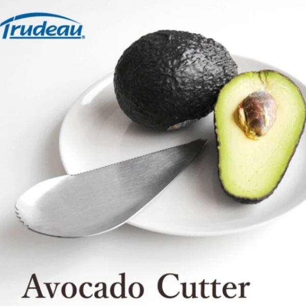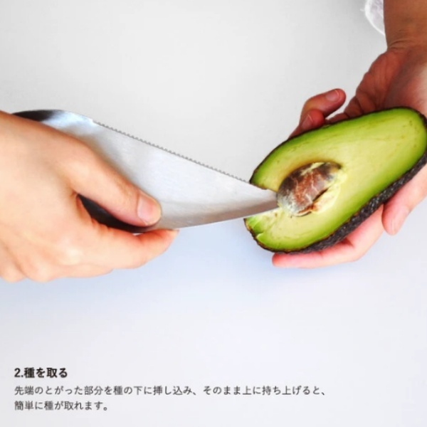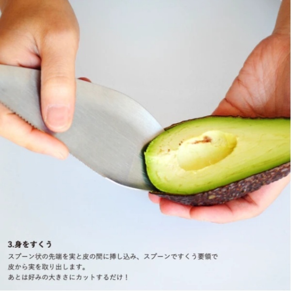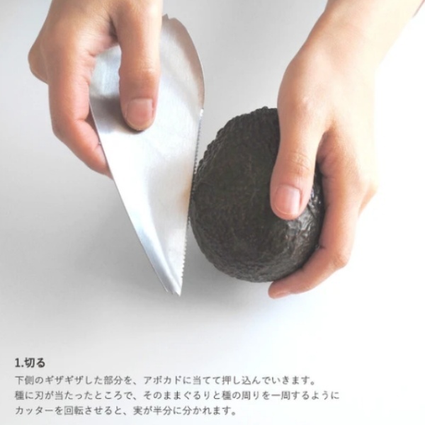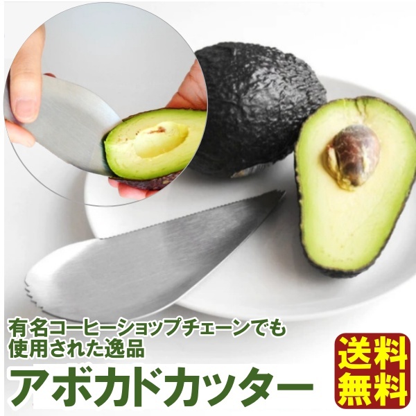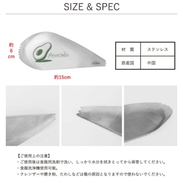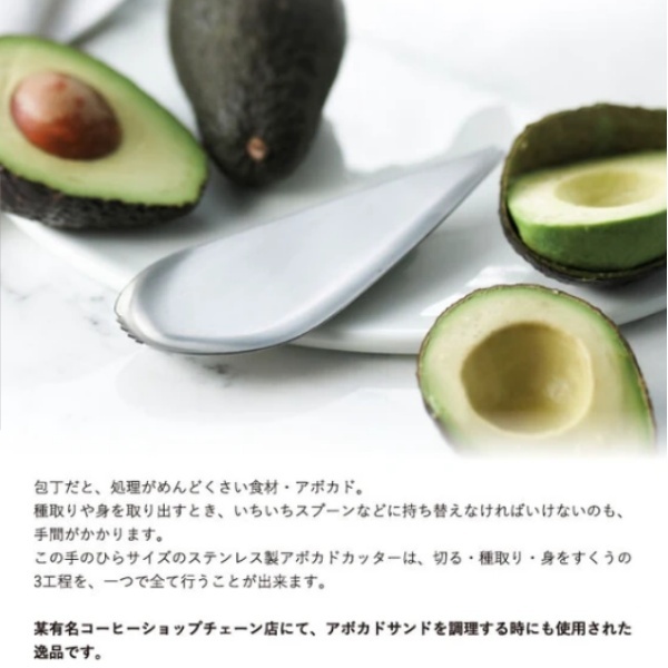【商品説明】こちらのステンレス製アボカドカッターは、カット・種取り・すくうの3工程を、一つで全て行うことが出来ます。某有名コーヒーショップチェーン店にて、アボカドサンドを調理する時にも使用された逸品です。【1.切る】下側のギザギザした部分を、アボカドに当てて押し込んでいきます。種に刃が当たったところで、そのままぐるりと種の周りを一周するようにカッターを回転させると実が半分に分かれます。【2.種を取る】先端のとがった部分を種の下に挿し込み、そのまま上に持ち上げると、簡単に種が取れます。【3.身をすくう】スプーン状の先端を実と皮の間に挿し込み、スプーンですくう要領で皮から実を取り出します。【サイズ】約150×60mm、約45g【生産国】中国(デザイン:カナダ)【素材】ステンレス【メーカー】南海通商