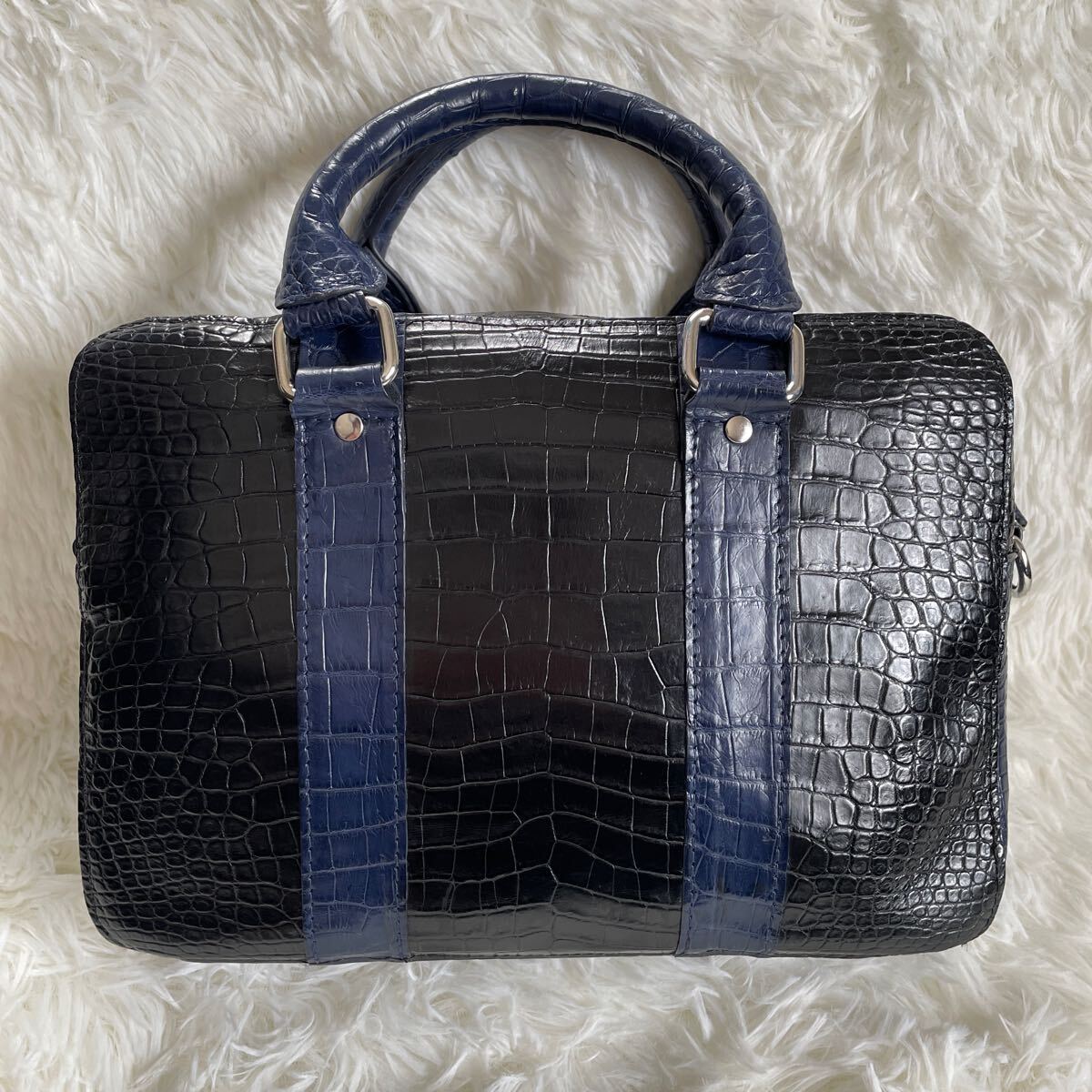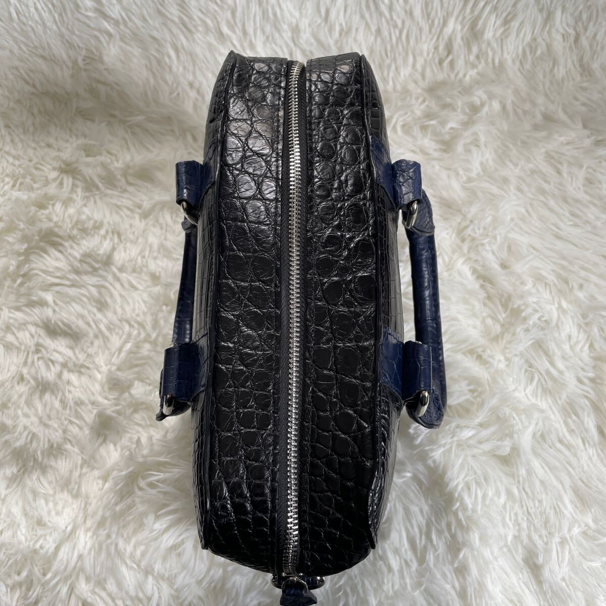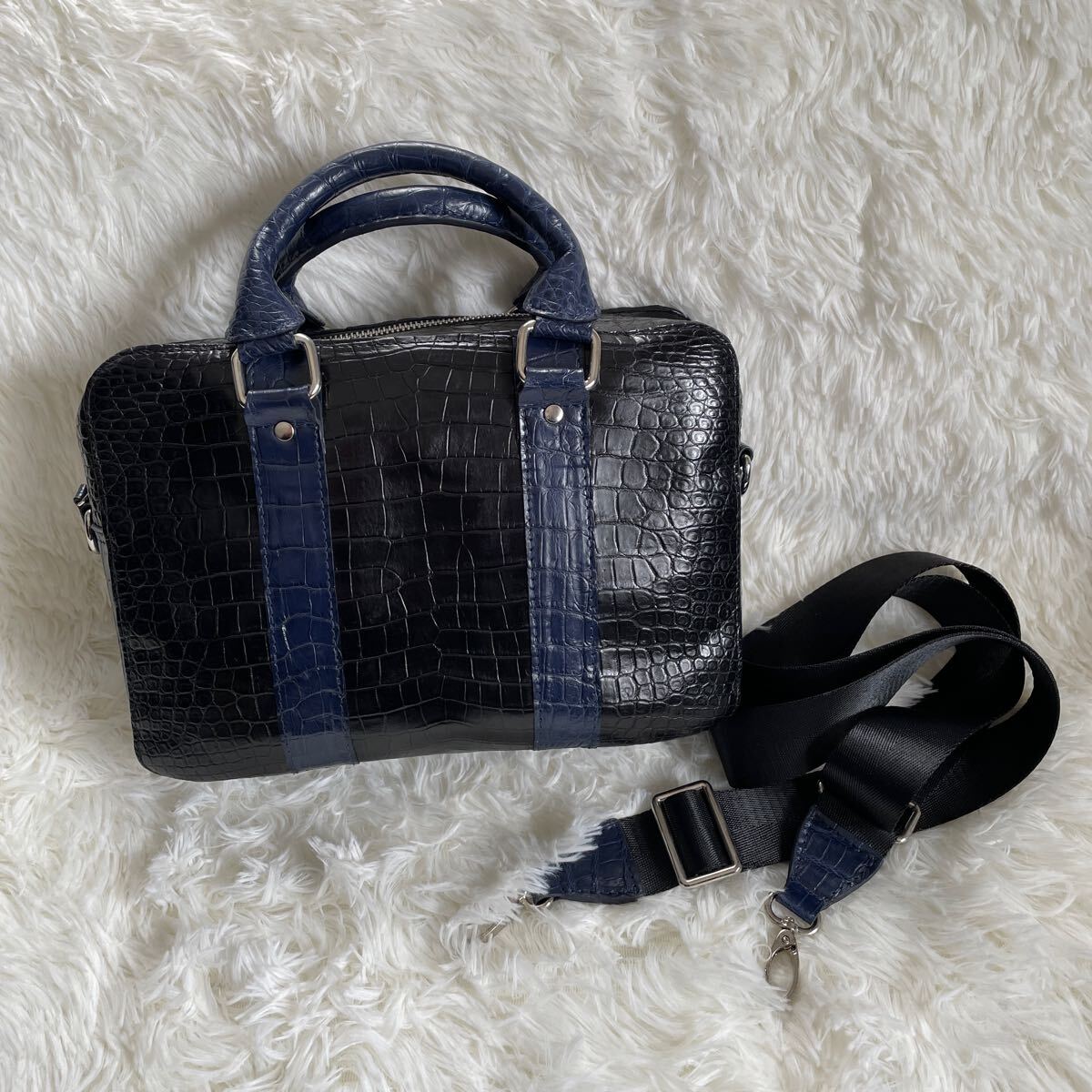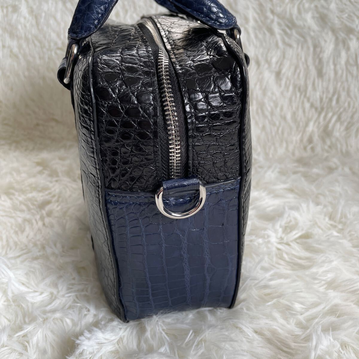 落ち着きのあるネイビー色を外装に、そして内側は牛革で仕上げており、底もしっかりとした作りにのなっております。また、クロコハンドルは持ちやすく握りやすくなっております。