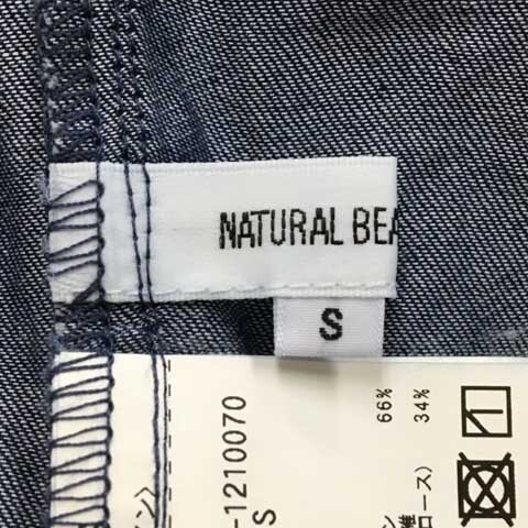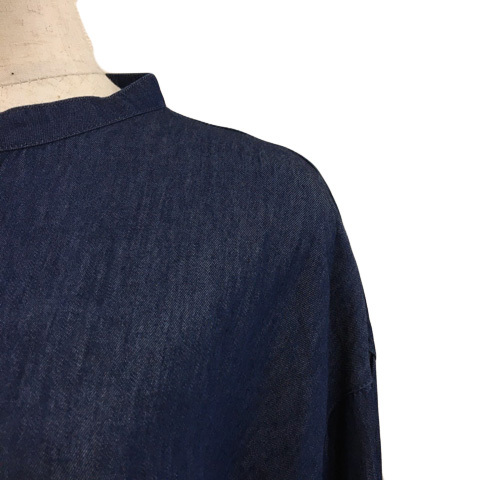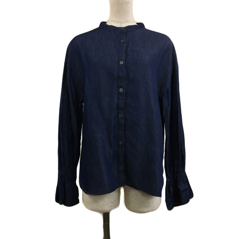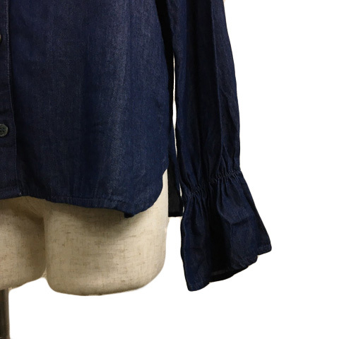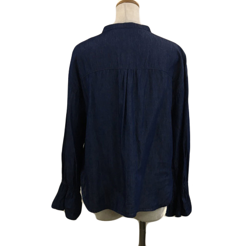 ナチュラルビューティーベーシック シャツ ブラウス デニム バンドカラー ギャザー 無地 キャンディースリーブ 長袖 S 紺 ネイビー