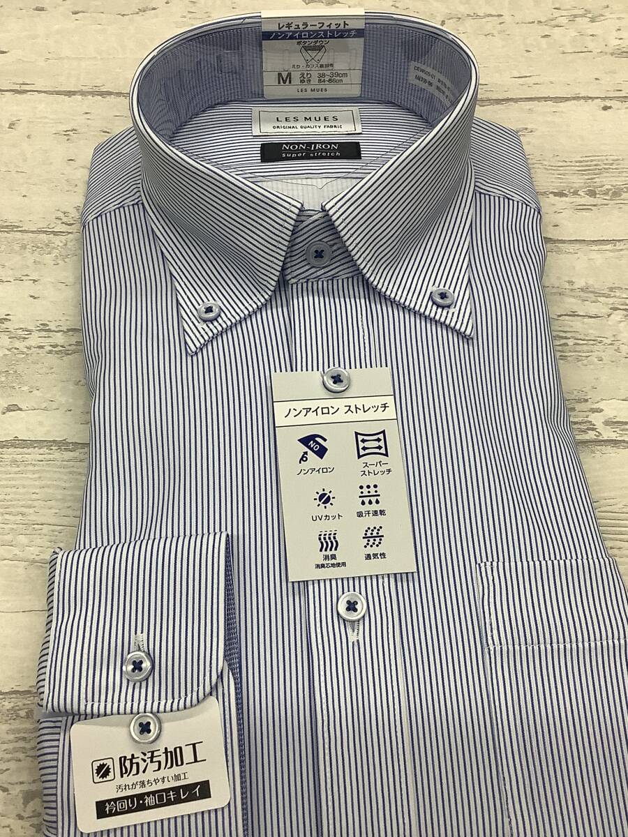 39-86 長袖Mサイズ ★サックスブルー系ストライプジャガード ニット生地ボタンダウン スーパーストレッチドレスシャツ