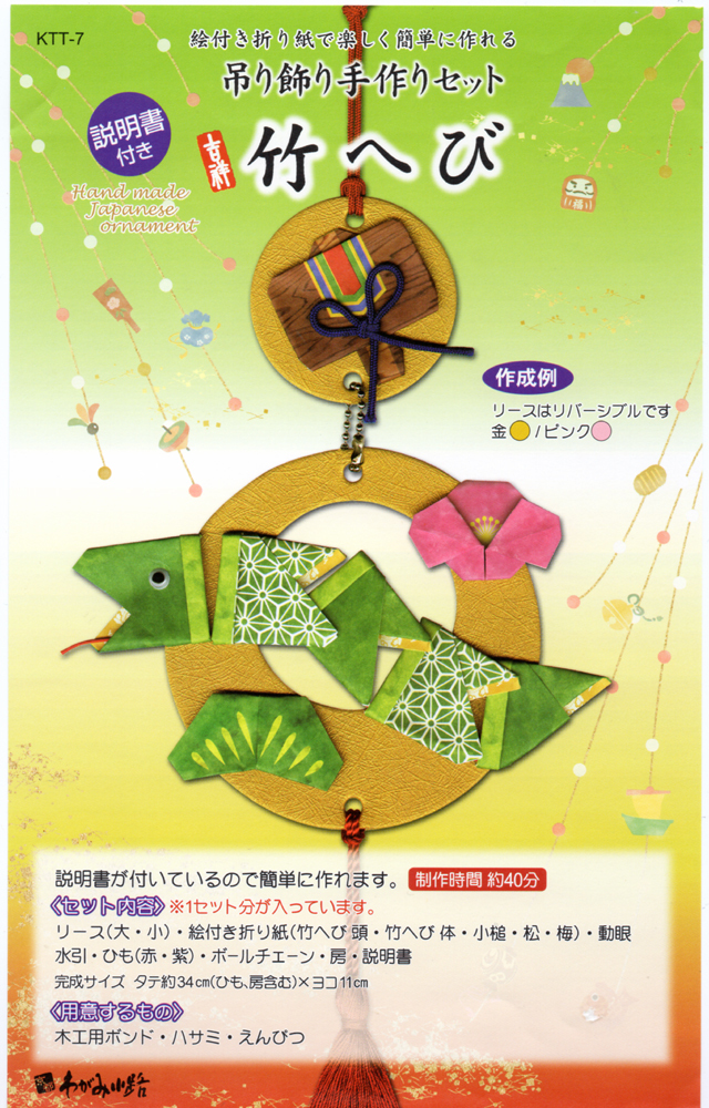 竹へび 吊り飾り手作りセット 組み立て済 わがみ小路 サイズ:約280x150㎜ 画像9(最後の画像)のように吊るす事ができるので、 窓辺や玄関などに縁起のいい干支のものを吊るして楽しむ、 下げもの飾りです。 雑貨店 店頭品の 干支飾り制作キット(店頭販売品・新品)を、 「自分で制作するのは不器用で難しいため、組み立てて欲しい」 (実際、慣れていない人が作るのは難しいです) というお言葉を受け制作したものなのですが、 希望された方にご縁をいただけなかった品になります。 手作り品ですので、若干の造りの不備などはご容赦ください。 画像3のパッケージ用紙は、最初のご落札者様のみに付属します。 また台紙には、アカとピンクがあります。 こちらも最初の落札者様のご希望を優先いたします。 外観の印象等は当方の主観によるところですので、著しく違わない限りは ご理解いただけますと幸いです。 ※商品を見た限りでは把握しきれず、説明不足な場合もあります。 可能な限りお答えいたしますので、心配な点はご利用前にご質問ください。 ※落札決定後のキャンセル、返品は商品に明らかな問題がない限り お受けできません。 気になる方はお控えください。よろしくお願いいたします。 | ||||