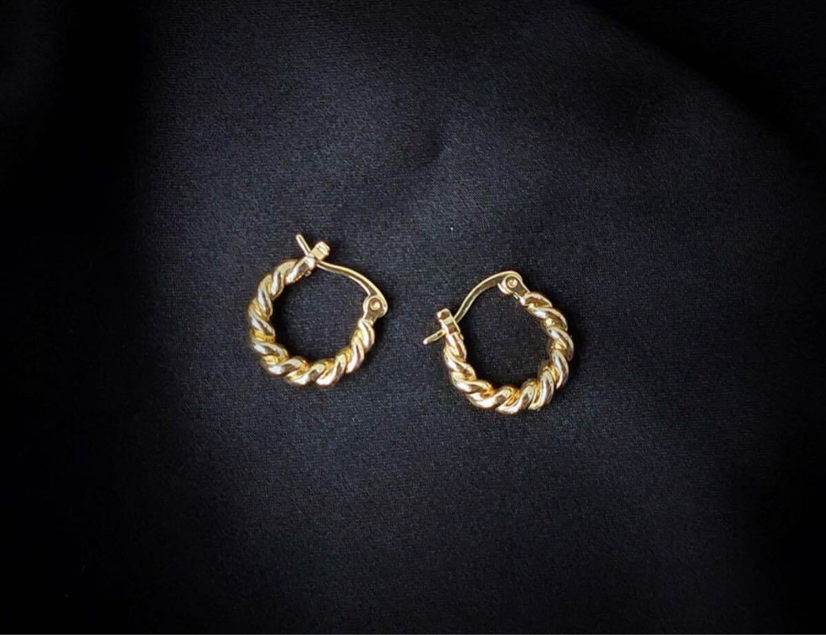 ツイストデザインのゴールドフープピアス、カジュアルスタイルに最適