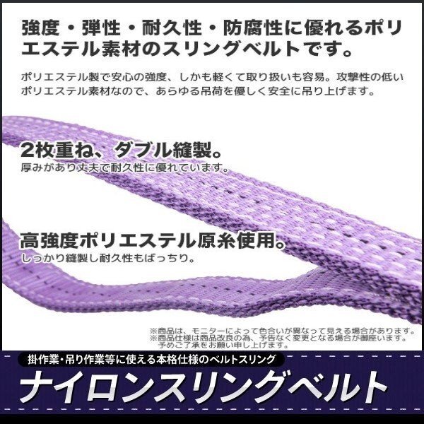 | 商品の詳細 | 玉掛作業・吊り作業にどうぞ!本格仕様のベルトスリングです。 強度、耐荷、耐久性に優れいているから安全性抜群! プレス用金型・大型機械・建築資材・木材・大型電化製品・家具・植木庭木・土管・ヒューム管・大口径鋼管・鍛造品・製紙ロール・貿易輸送・小型船・船内や湾岸の荷役などの吊り上げ、移動、運送、運搬など様々な作業にお使いください。 両端アイタイプです。 ベルトサイズ(約):ベルトサイズ(約):長さ10000mm×幅25mm 材質:ポリエステル100% 最大使用荷重(能力): ストレート吊:1000kg チョーク吊:800kg バスケット点吊:2000kg PL保険加入商品、欧州CE規格+GS&TUVマーク取得商品 支払詳細 | ①UFJ銀行 ②ゆうちょ銀行 ③商品代引き ④楽天銀行決済 ⑤PayPayPayPay⑥クレジットカード⑦ヤフーカード Visa Mastercard JCB Diners American Expressの中からご自由に、お客様のご都合に合わせて選べる決済です。 | 発送詳細 | ・こちらの商品は基本送料無料となります。但し(北海道+330円、沖縄離島+550円別途) | 佐川急便の発送となります。 ・運送会社は当社指定の運送業者での発送となります。お客様の運送便の指定はできません。 ・通常、ご入金確認後1~3営業日で発送します(予約商品除く)。配送業者の状況によって、出荷予定日と実際の出荷日が前後する場合がございますが、あらかじめご了承願います。 ・日時指定は運送会社の対応時間で承りますが、まれに運送業者の都合や交通事情により指定通りに届かない場合もございます。 ・代引きの場合は手数料がかわります。 1万円未満300円 1万円以上3万円未満400円 3万円以上10万円未満600円 10万円以上1000円 返品、及び交換について | ・薄利でご提供していますので、初期不良は商品到着日より7日以内とさせて頂きます。商品到着次第、早急に商品チェックをお願いいたします。尚、交換品発送処理は当社に商品が到着してからとなりますので、予めご了承下さい。 | ・お客様の操作ミスや誤使用による不良との勘違いの場合は、着払い送料とご返送の送料をご負担して頂く形となりますので、不良時のご返品の際は動作や不良箇所をご確認の上、まずはご連絡をお願い致します。 ・箱も含めてすべてのパーツがそろってない状態。(1つでも欠けていますと交換致しかねます) ・お客様のご使用中にキズや汚れ破損が生じた商品は返品できかねます。 ※返送の際は、当店指定業者以外での返送は対応できかねますのでご注意ください。指定外の発送方法をとられた場合、差額の代金請求を行わせて頂く場合が御座います。 ・初期不良時のいきなりの「悪い・非常に悪い」での評価連絡に対しては対応できません。 注意事項 | ※出品中の商品は他サイトと同時販売の為、また、商品自体に問題があった場合などは、オークション終了前に出品を予告なく取り消しさせて頂く場合がございます。 | ※またオークション終了落札後でも同様の事態が起こりうる場合がございます。 ※その際は納期等ご連絡致しますがキャンセルをさせて頂く場合もあります。 ※土日祝を除き24時間以内にメールが届かない場合はご連絡ください。また、フリーメールやケータイ等でメール未着になる場合がありますので、未着の場合はメールにてご連絡ください。 ※評価からのご連絡は対応出来ませんので、 必ずメール及び連絡掲示板(非公開)にてご連絡を下さいますようお願い致します。 誠にお手数ですが連絡掲示板より非公開にてご連絡をお願いいたします。 ※落札後は早急にご購入手続きを行って頂きますようお願い申し上げます。詳細は「オークションヘルプ 落札した後の流れ(落札者)」をご参照ください。 ※落札日より3日経過しご注文手続きを行って頂けなかった場合はキャンセル扱いとなり、それ以降ご注文を承れなくなる場合が御座います。 ・ご購入手続き未実施が起因による、落札者削除等あらゆる処置につきまして、当方では一切責任を負いませんので、予めご了承願います。 ※送料や配送方法は変更される可能性があるため、落札後の購入手続き画面を確認してください。尚、お支払い金額不足の場合は再度不足分をご入金頂くこととなりますので、ご確認の上ご入金下さいませ。 ※全てのご対応は、お客様のご連絡内容を正確に確認する為、また全ての内容を記録に残すため、メールのみのご対応となります。お電話・FAX等でご連絡頂きました場合、ご対応致しかねる場合が御座いますので予めご了承をお願い申し上げます。 ・当店はご落札の通知、発送伝票番号の通知は、必ず行っております。お客様のメール受信設定によっては、落札通知・取引案内メール等、お送りできない場合が御座います。メールの受信設定やメールフィルタリング設定等に起因するご連絡の遅れやお取引の遅延、及びそれに伴う損害など弊社では一切責任は負いかねますのでご注意下さい。 ※ご入札前に必ずご自身登録のメールアドレスのご確認と、迷惑メールフォルダ設定等、当店メールアドレスdiy