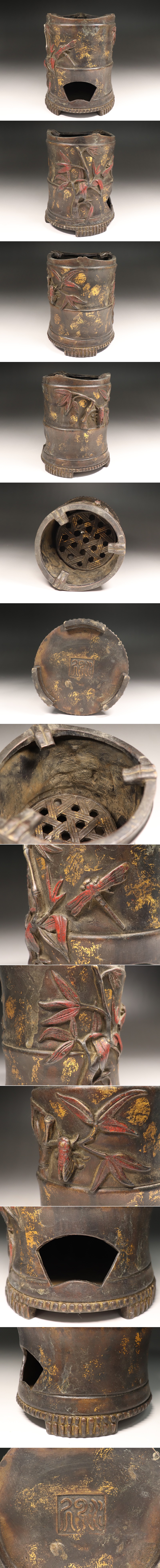| ■古銅■鍍金・三足涼炉・蝉・蜻蛉・獣口・風炉・瓶掛・鉄瓶・在印在銘・煎茶道具・f5111h | ||||||||||||||||||||