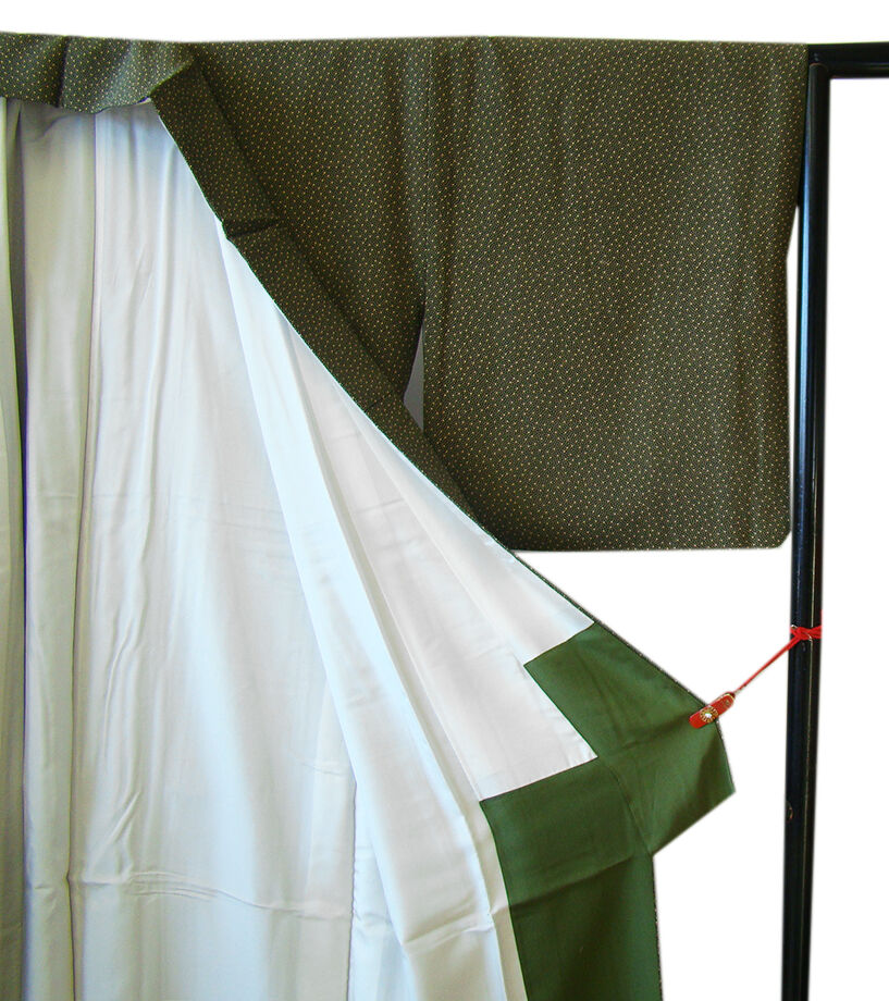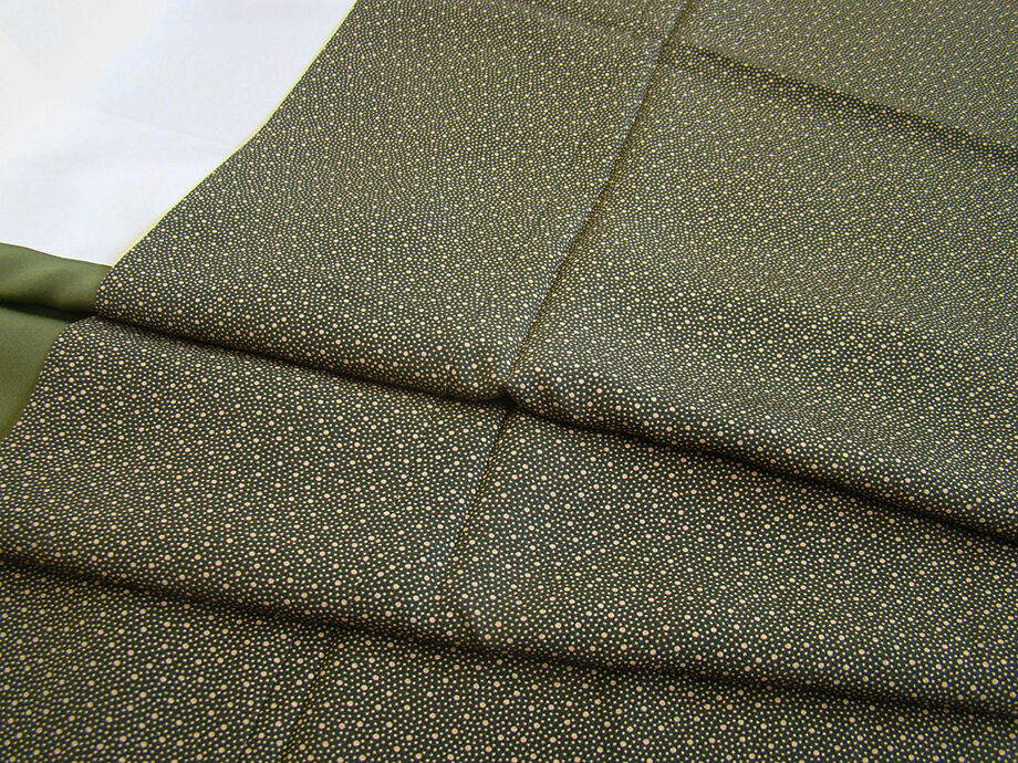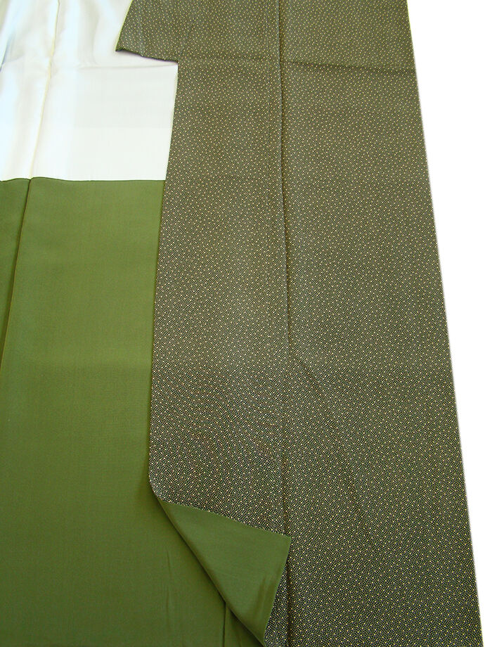 | 商品説明 | こちらのお品は「袷」でございますので、10月~5月までお召頂ければと思います。 とてもしなやかなさらりとした着心地良い重めの滑らかな重めの極上ちりめん地の生地、 渋い深緑色地に薄い洗柿色の大小霰の江戸小紋柄の染柄、 八掛は松葉色(正絹)、幅広い年代の方にお召頂けます。 |