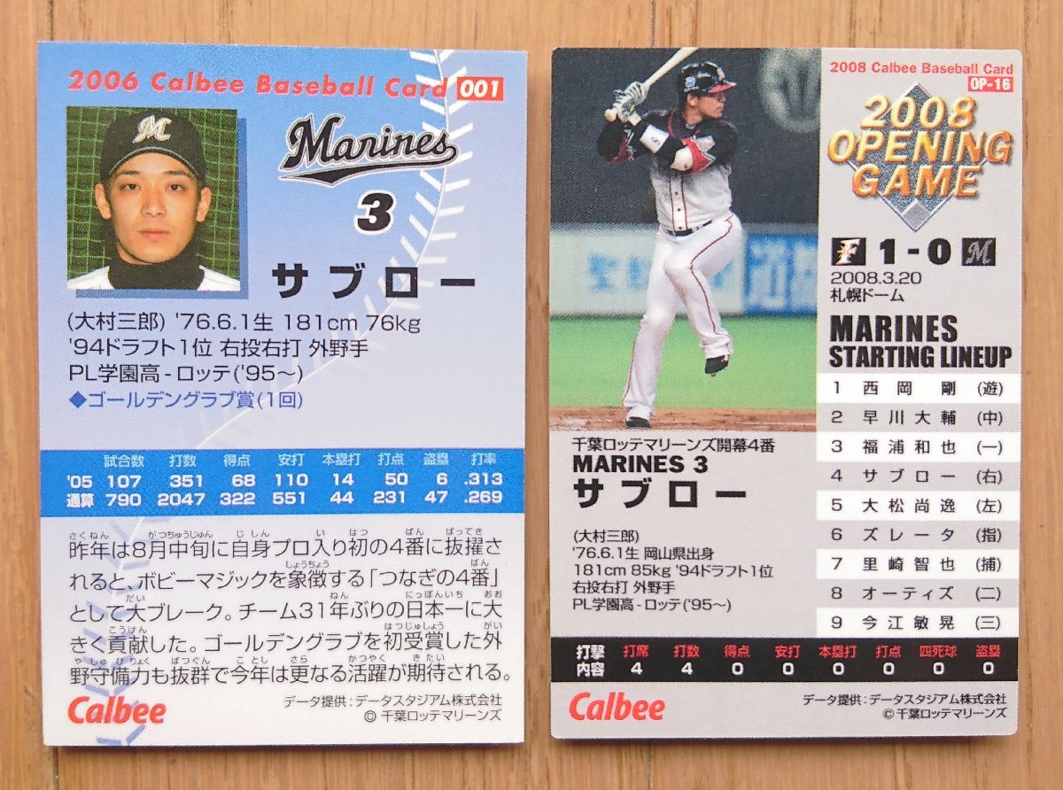 【カード・カルビー】サブロー (大村三郎) 2006年001 / 2008年OP-16 開幕戦 計2枚セット 千葉ロッテマリーンズ カルビープロ野球チップス