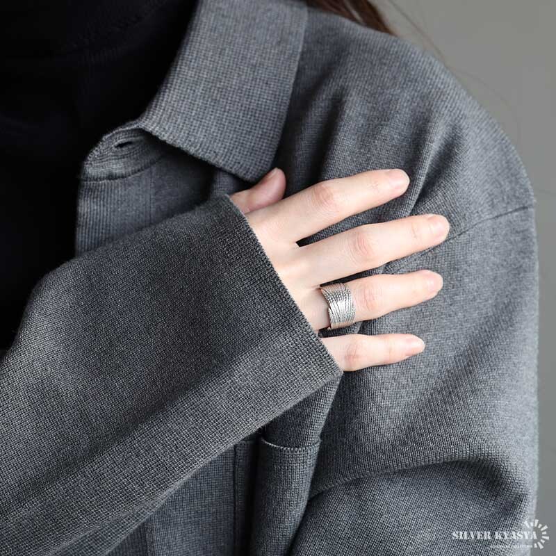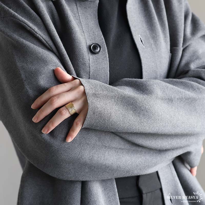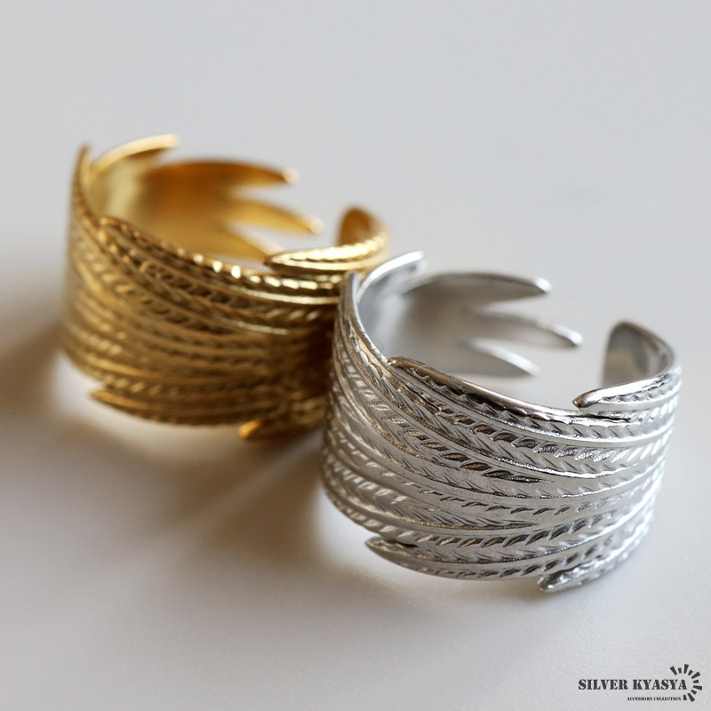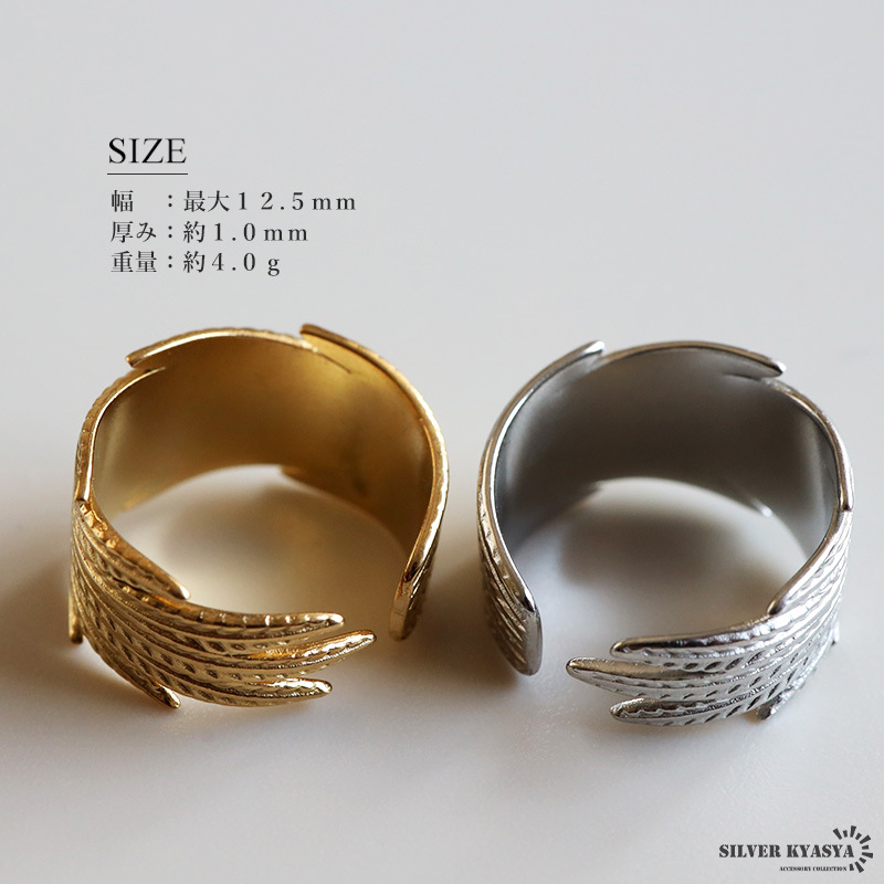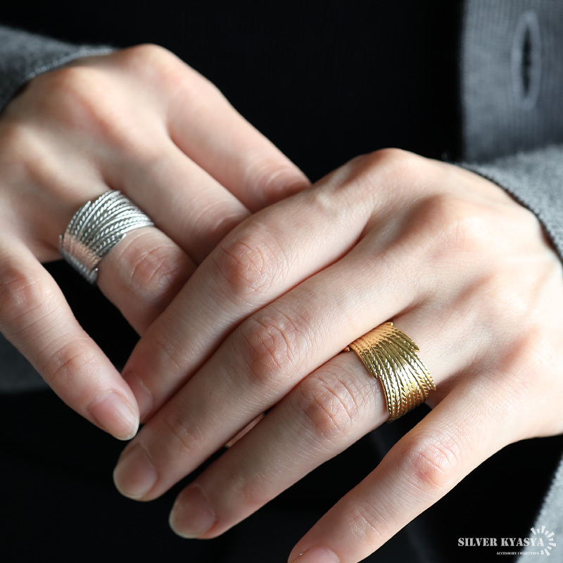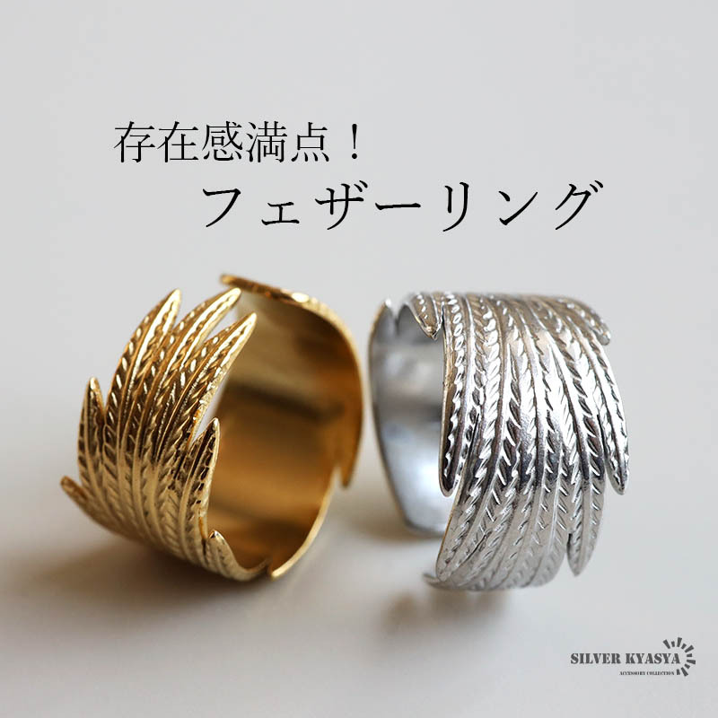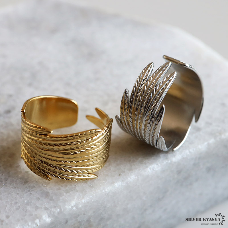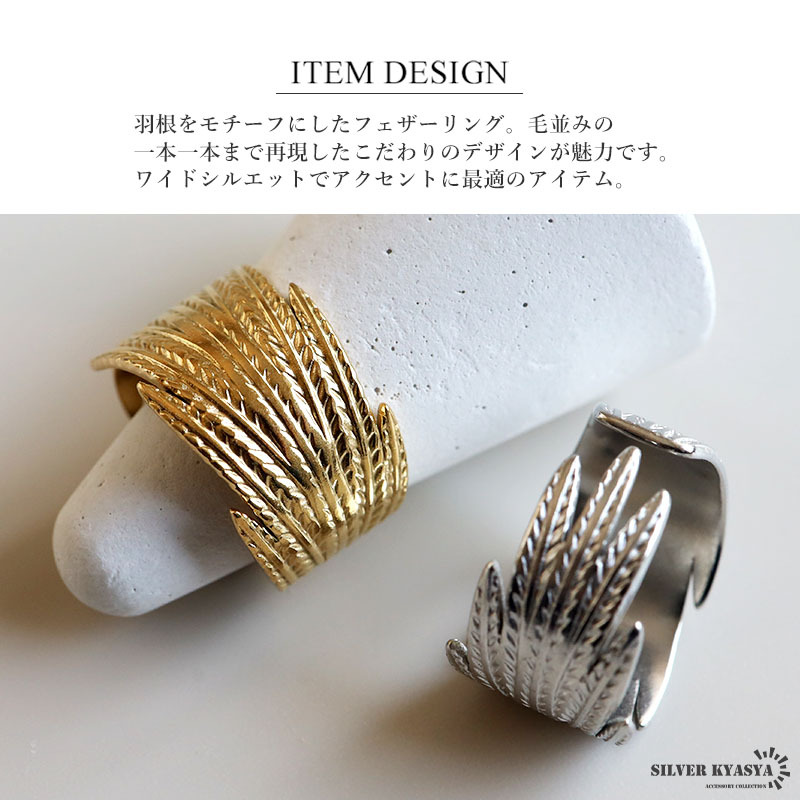 羽根をモチーフにしたフェザーリング。毛並みの一本一本まで再現したこだわりのデザインが魅力です。ワイドシルエットでアクセントに最適のアイテム。