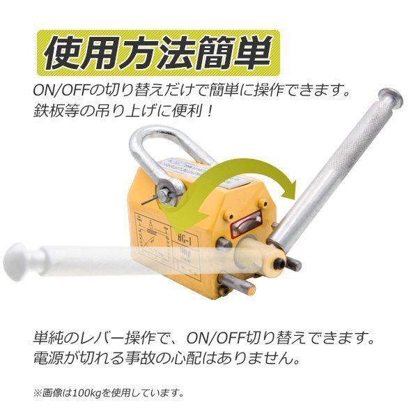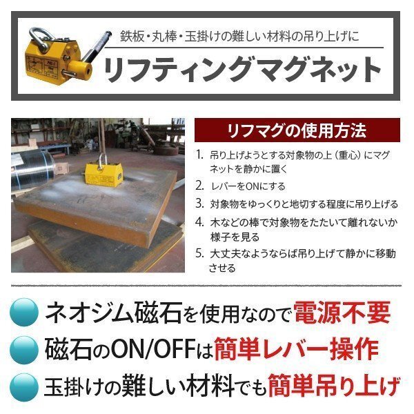 レバー操作で簡単にON/OFF操作ができる最大能力300kgのリフティングマグネットです。