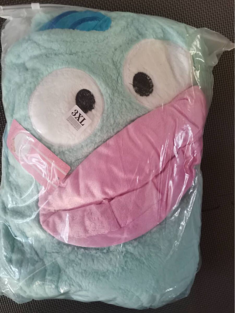 水色のフリース素材で、キャラクター風のデザインが特徴の3XLサイズのフード付きルームウェア。
