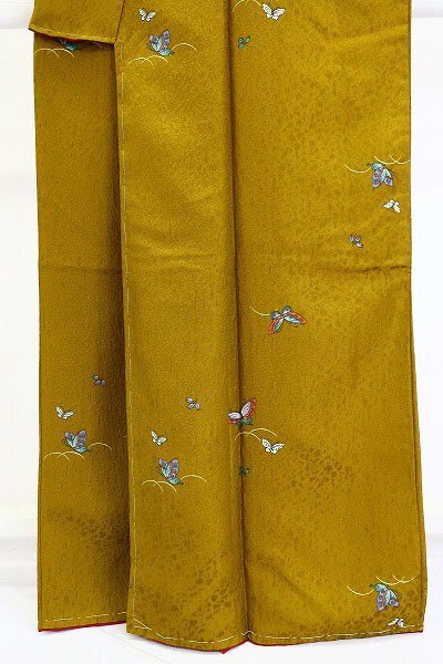 【着物フィ】未使用品 小紋 芥子色 蝶 身丈163.0cm 裄丈68.0cm お洒落 カジュアル 仕立て上がり 正絹 m-7319/B> |