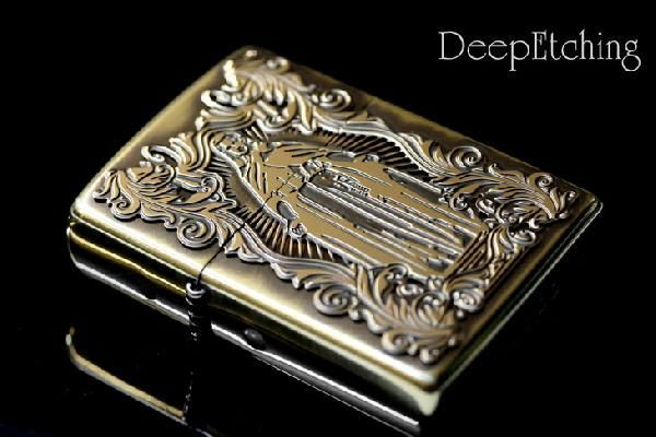 通常のエッチング(腐食加工)は、デザインを凹ませて表現するのに対し、デザインを凸に浮き上がらせる逆エッチングを施したスペシャルなZippo。彫刻加工のような繊細、かつ重厚さを漂わせる深彫り。表、裏それぞれ異なるデザインに銀いぶし仕上げ。アクセ感覚のカッコよさと重厚さが同居する逸品です。