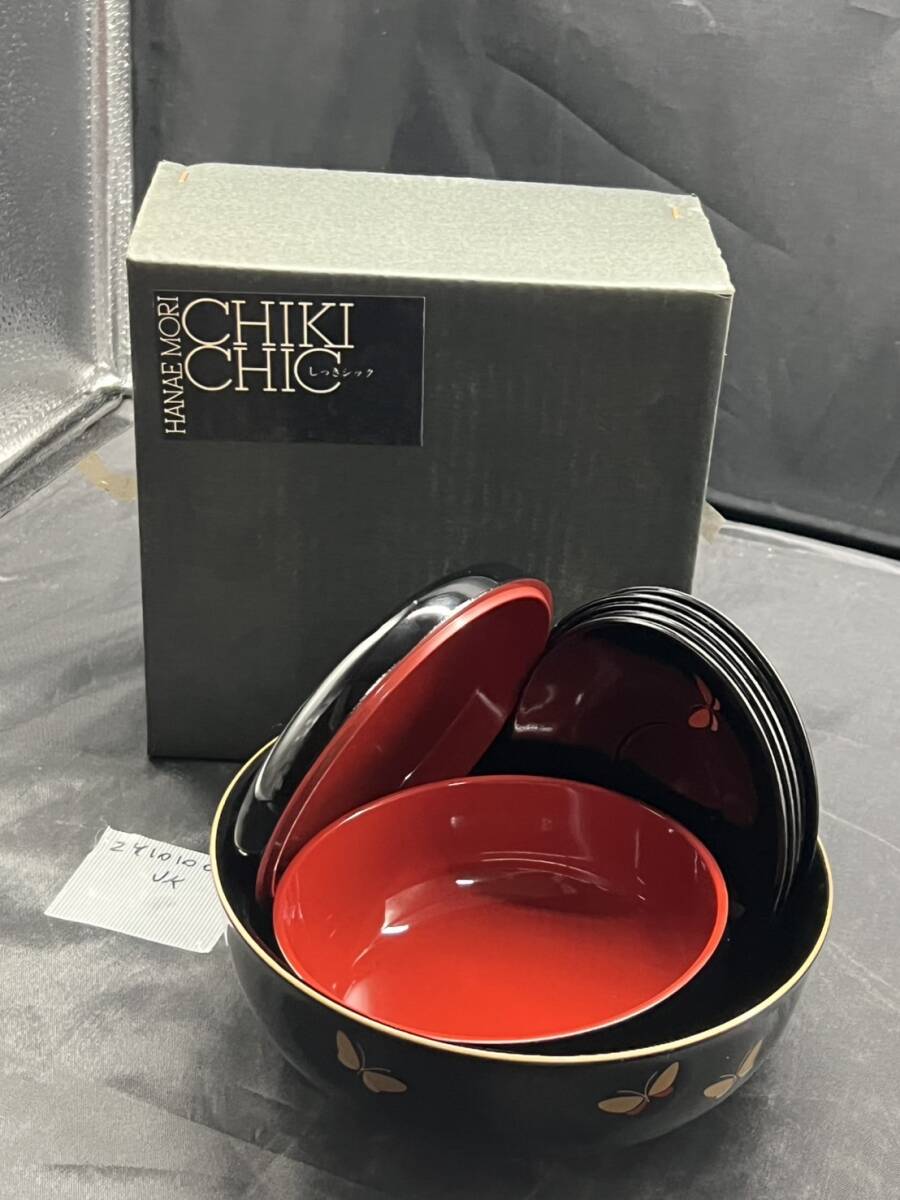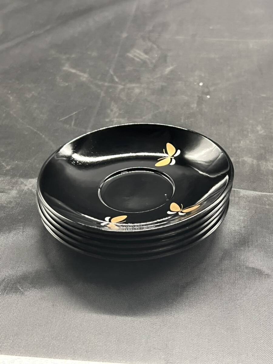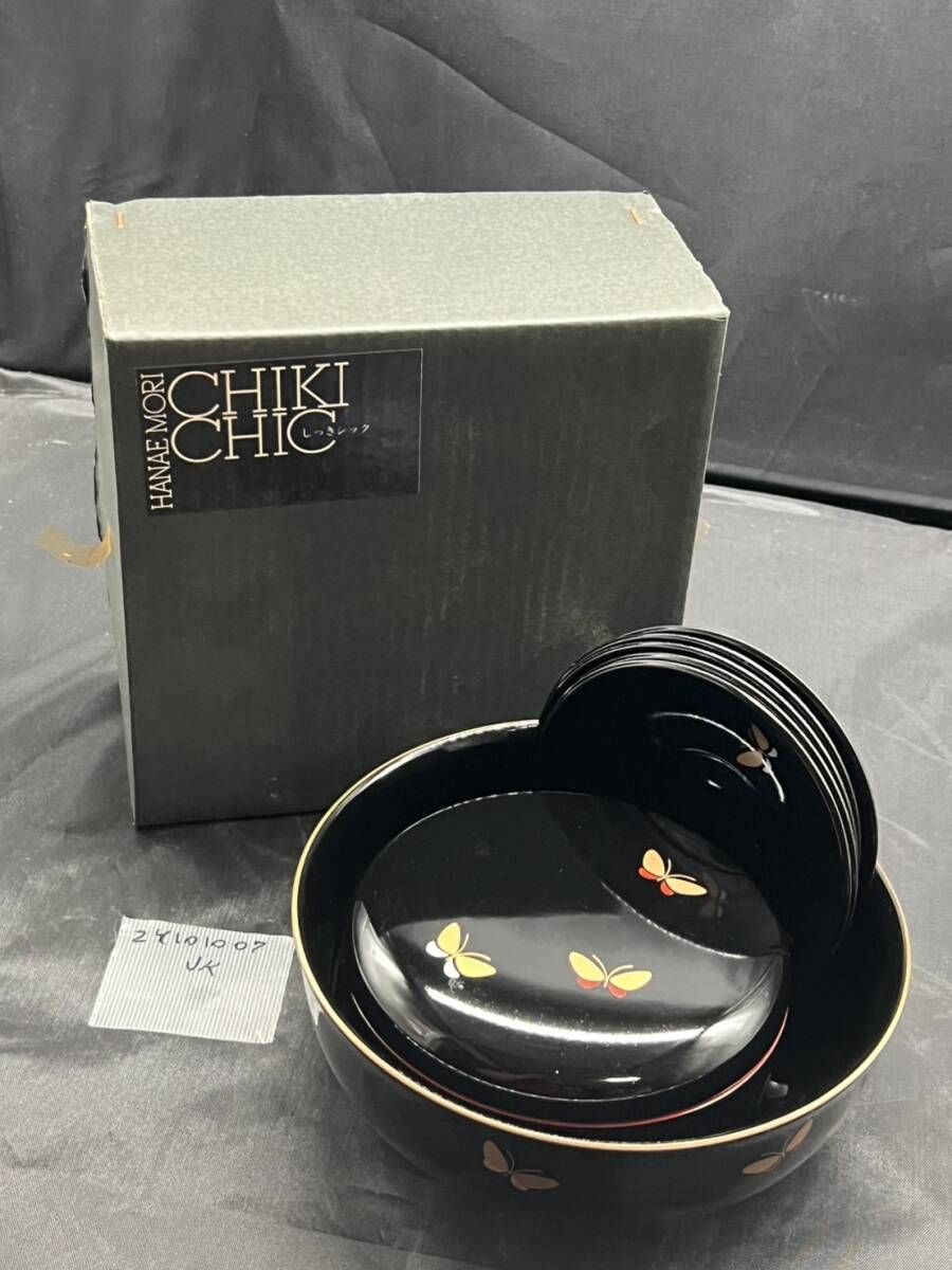 HANAE MORI(ハナエモリ)の「CHIKI CHIC」シリーズの漆器菓子椀と皿のセットです。黒と赤のコントラストが美しく、金色の蝶のワンポイントが上品なデザイン。未使用品で、長期保管されていたお品です。