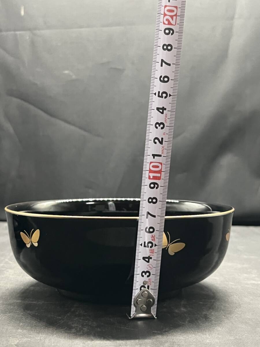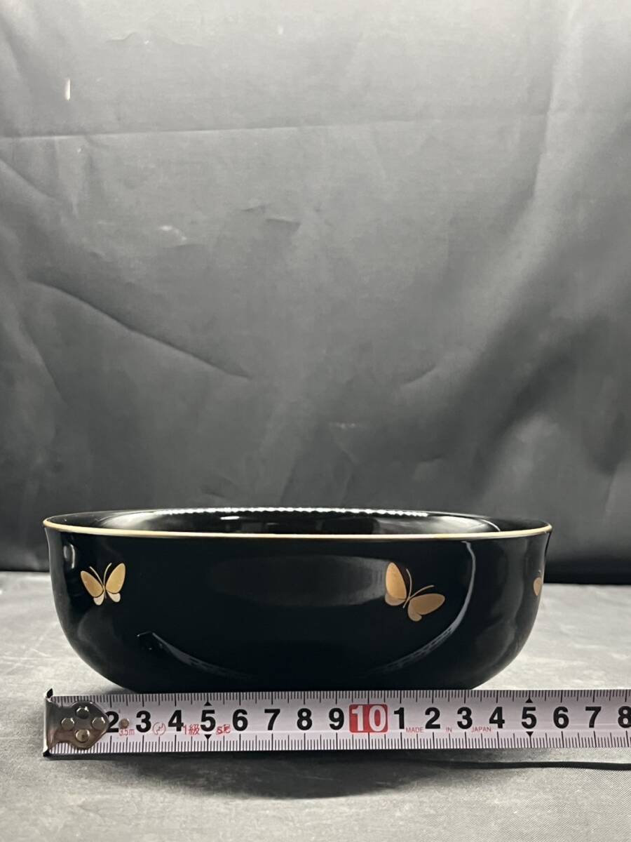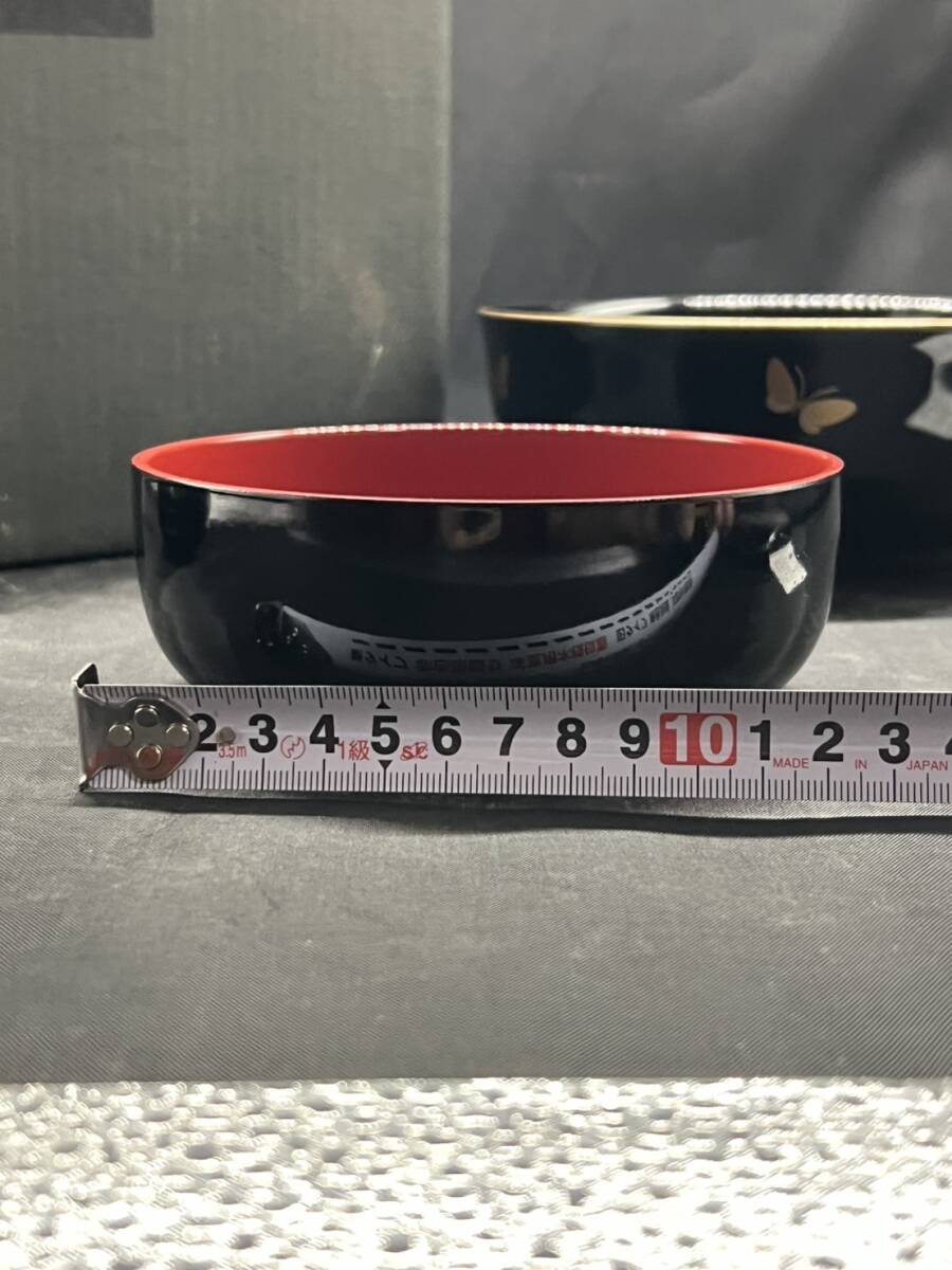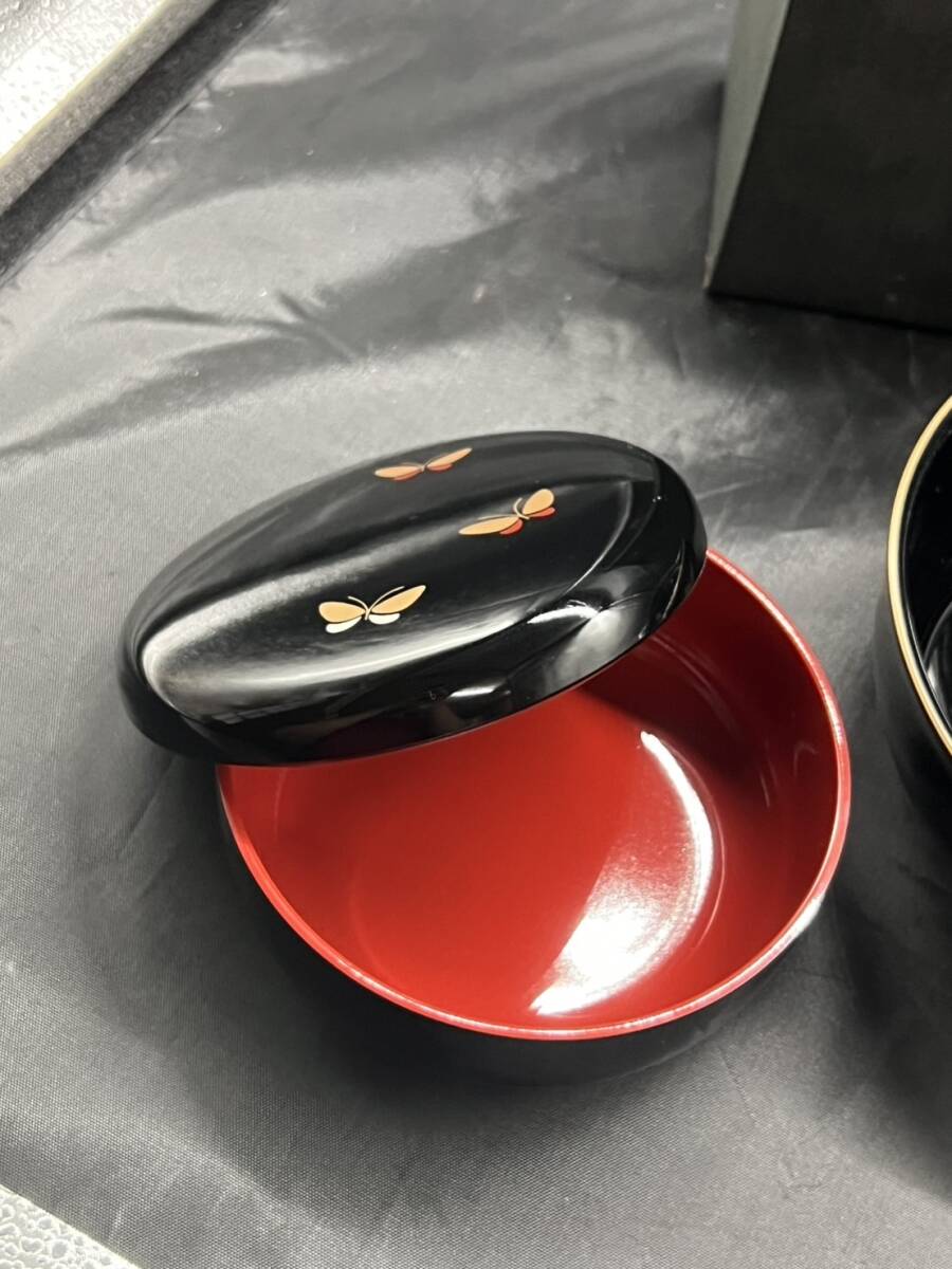 HANAE MORI(ハナエモリ)の「CHIKI CHIC」シリーズの漆器菓子椀と皿のセットです。黒と赤のコントラストが美しく、金色の蝶のワンポイントが上品なデザイン。未使用品で、長期保管されていたお品です。