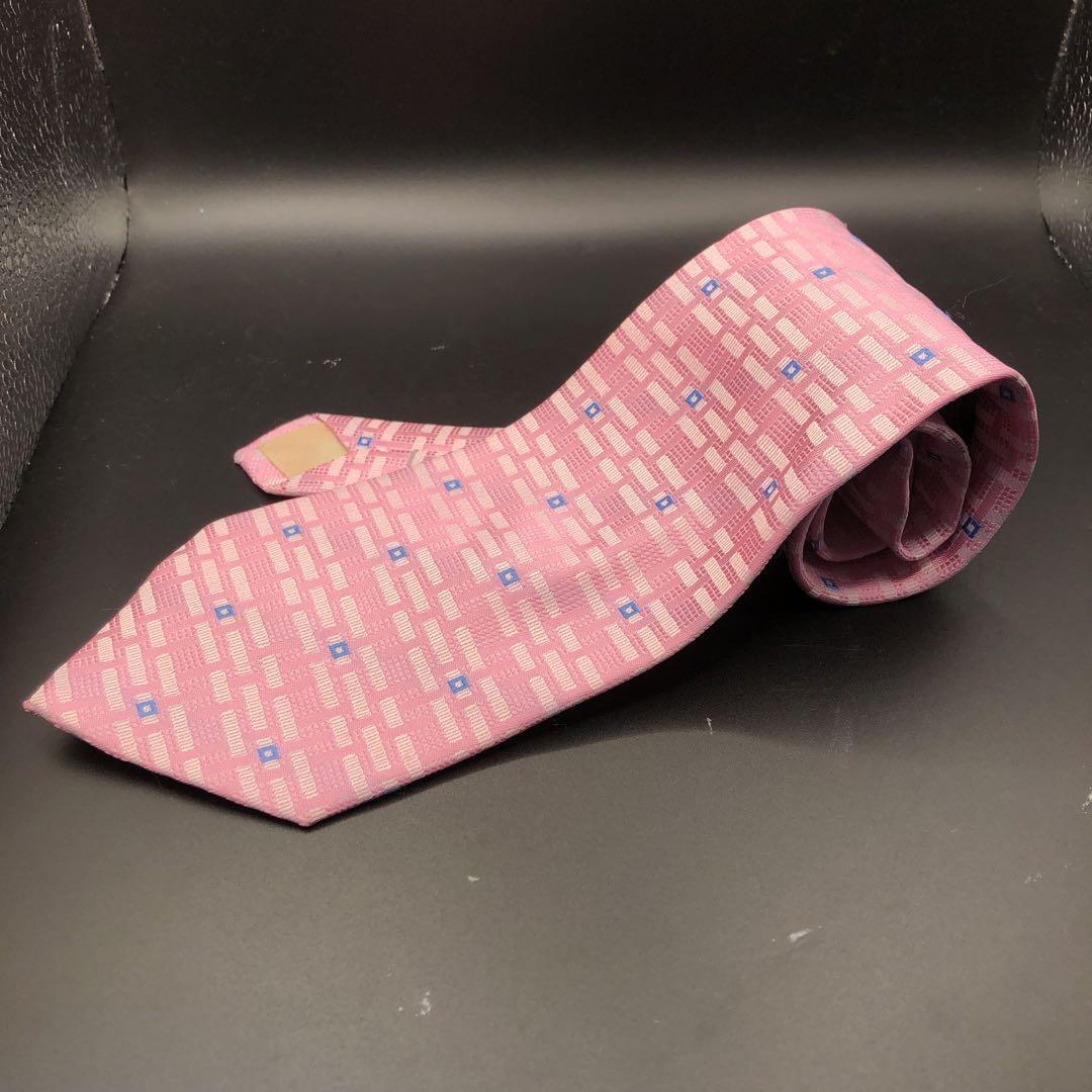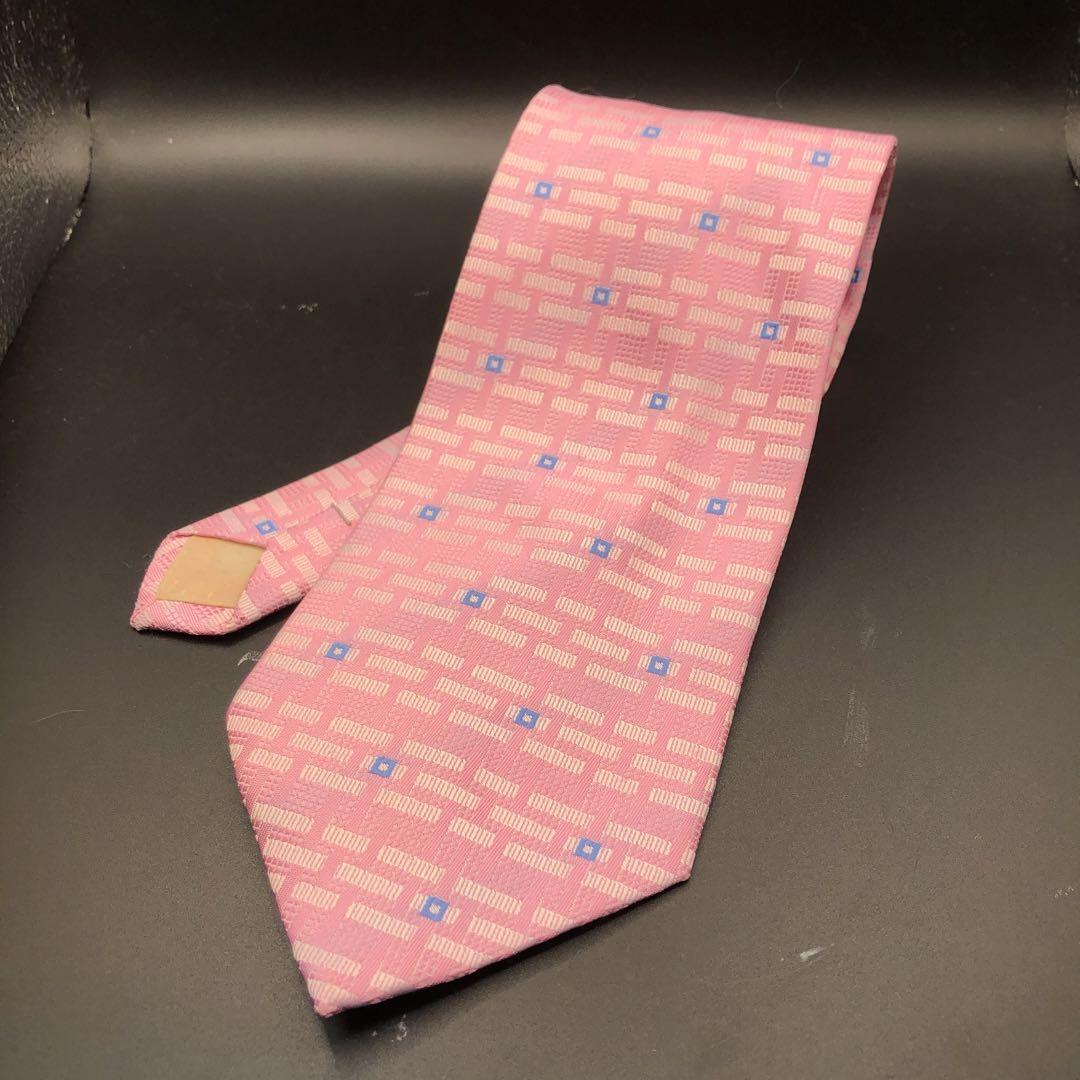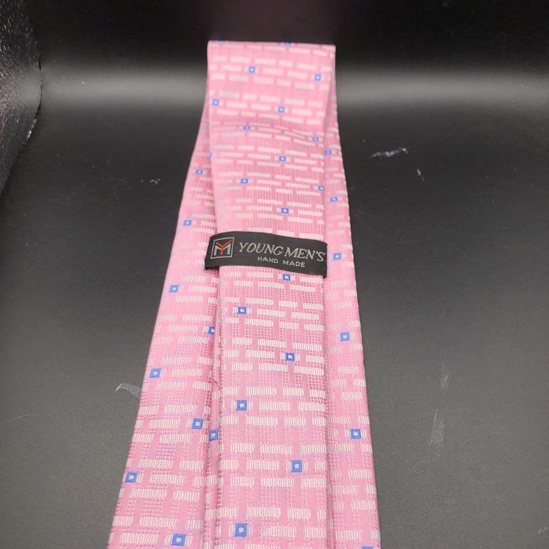 ピンクの幾何学模様が特徴のハンドメイドネクタイ。