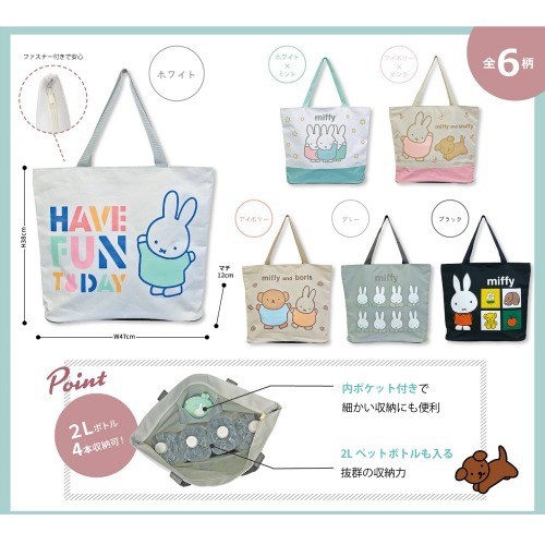 かわいいミッフィーのイラストがプリントされたトートバッグマチ付きで2Lペットボトルが4本入るほどの大容量便利な内ポケット付きファスナー式で中身が見えない、こぼれないので安心して使えます水滴が付きにくい内側撥水加工お買い物や通勤通学、塾通いなど様々な用途で活躍しますサイズ:約47×38×マチ12cm生地:ポリエステル 底パイピング:ポリエチレンプリント、生地カラーの色移り、擦れなどがございます。ご了承の上でお買い上げください。