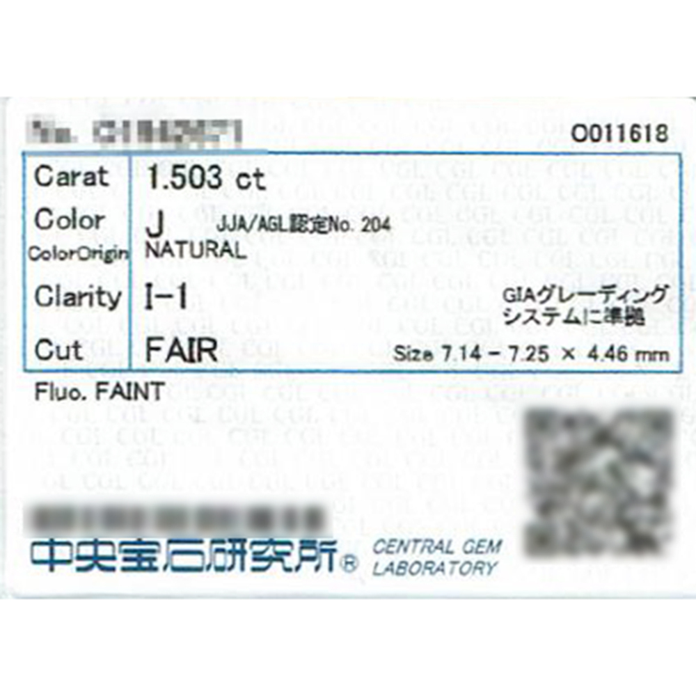 中石質 | 天然ダイヤモンド 1.568ct 【カラー】I 【クラリティ】I-1 【カット】GOOD 【鑑定機関】中央宝石研究所 天然ダイヤモンド 1.503ct 【カラー】J 【クラリティ】I-1 【カット】FAIR 【鑑定機関】中央宝石研究所 |