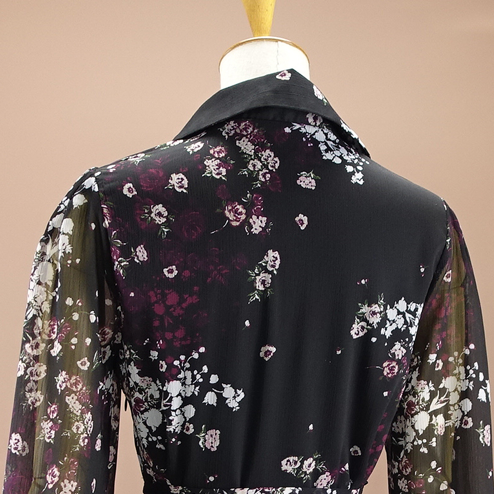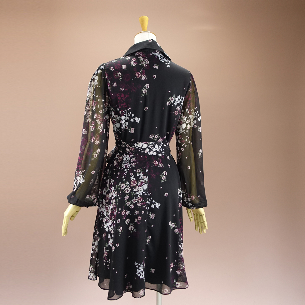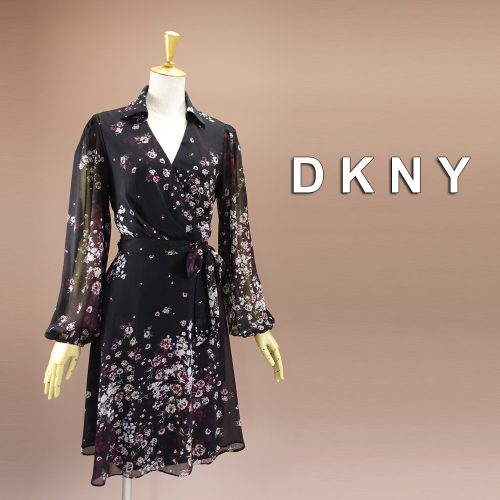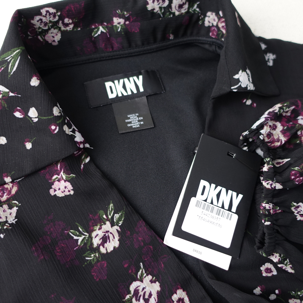 新品 DKNY 9号から11号 ダナキャラン 黒 赤紫 白 花柄 シフォン シャツワンピース パーティドレス 長袖 結婚式 二次会 通勤 華41K2806