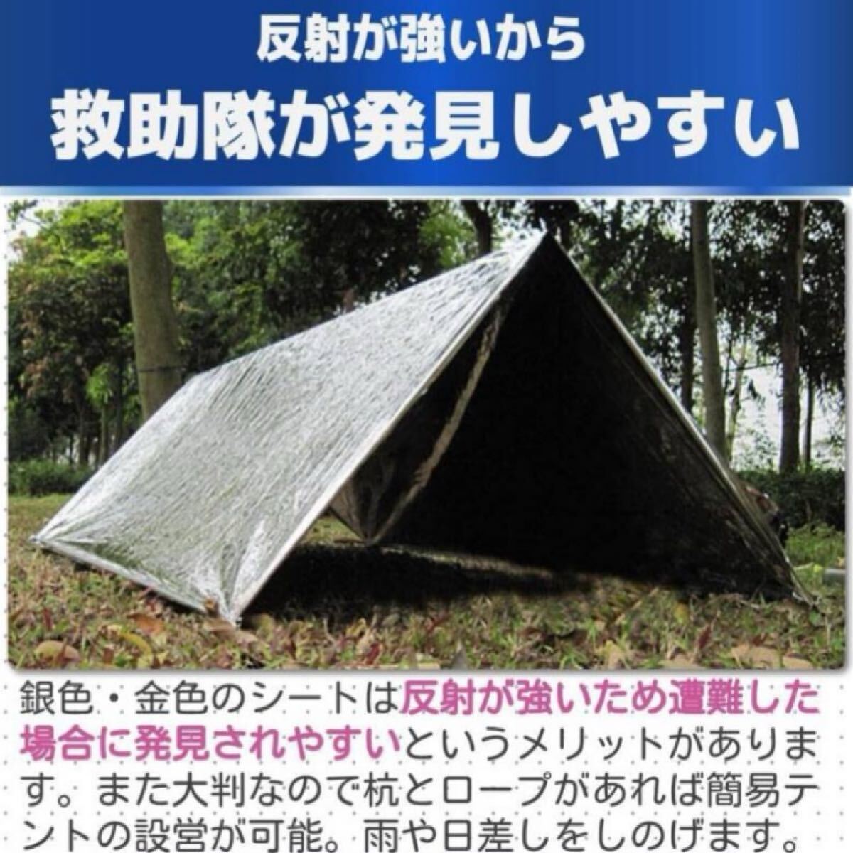 【救助隊が発見しやすい】銀色・金色のシートは反射が強いため遭難した場合に発見されやすいというメリットがあります。また大判なので杭とロープがあれば簡易テントの設営が可能。雨や日差しをしのげます。