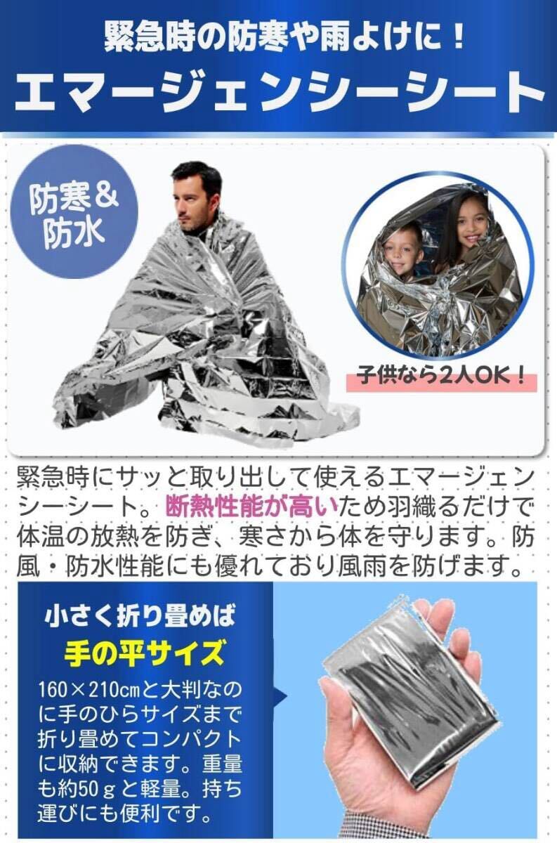 【エマージェンシーシート】緊急時にサッと取り出して使えるエマージェンシーシート。断熱性能が高いため羽織るだけで体温の放熱を防ぎ、寒さから体を守ります。防風・防水性能にも優れており風雨を防げます。