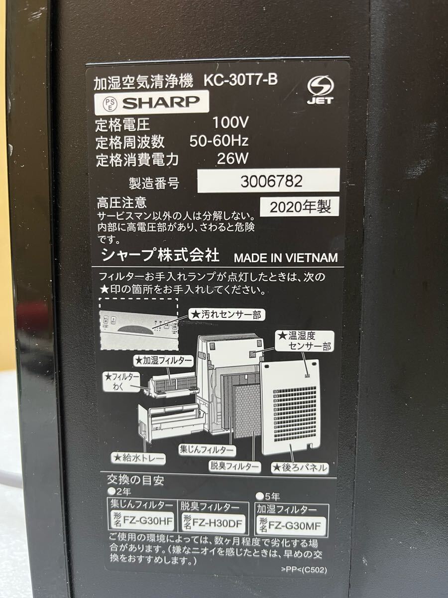 RE2815 SHARP シャープ 加湿空気清浄機 KC-30T7-B プラズマクラスター ブラック 通電確認済み 現状品 0303