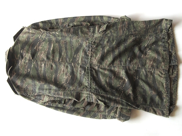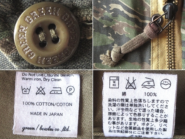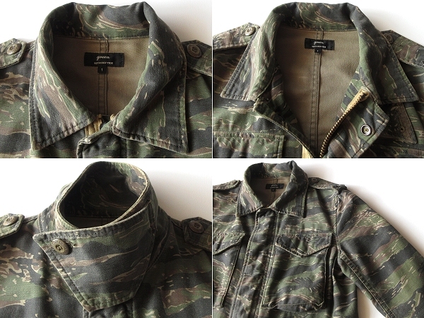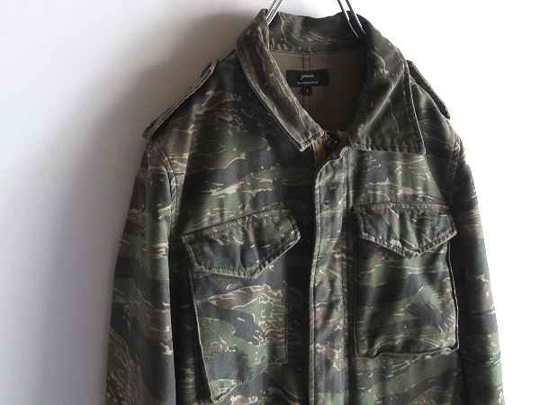 ハイクの前身ブランド、グリーンのジャケット。ミリタリージャケットをベースに、ロング丈にデザインされております。タイガーストライプのコットンツイルを使用。肩のロゴプレートがさりげないアクセントになります。上質な素材使いと綺麗なシルエットで、様々なコーディネートにお使い頂ける一着です。